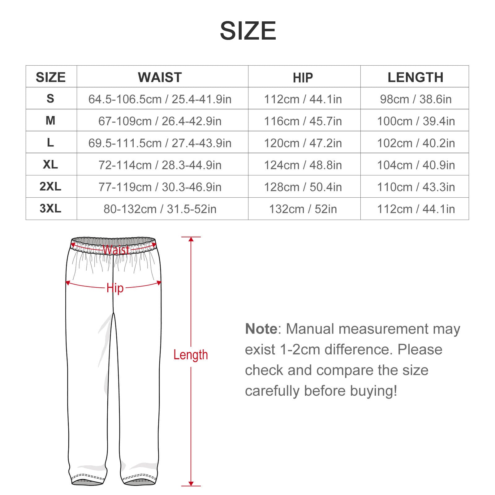 | Size | 1/2 Shoulder (cm/in) | Chest (cm/in) | Sleeve Length (cm/in) | Length (cm/in) | Waist (cm/in) | Hip (cm/in) | Pants Length (cm/in) |