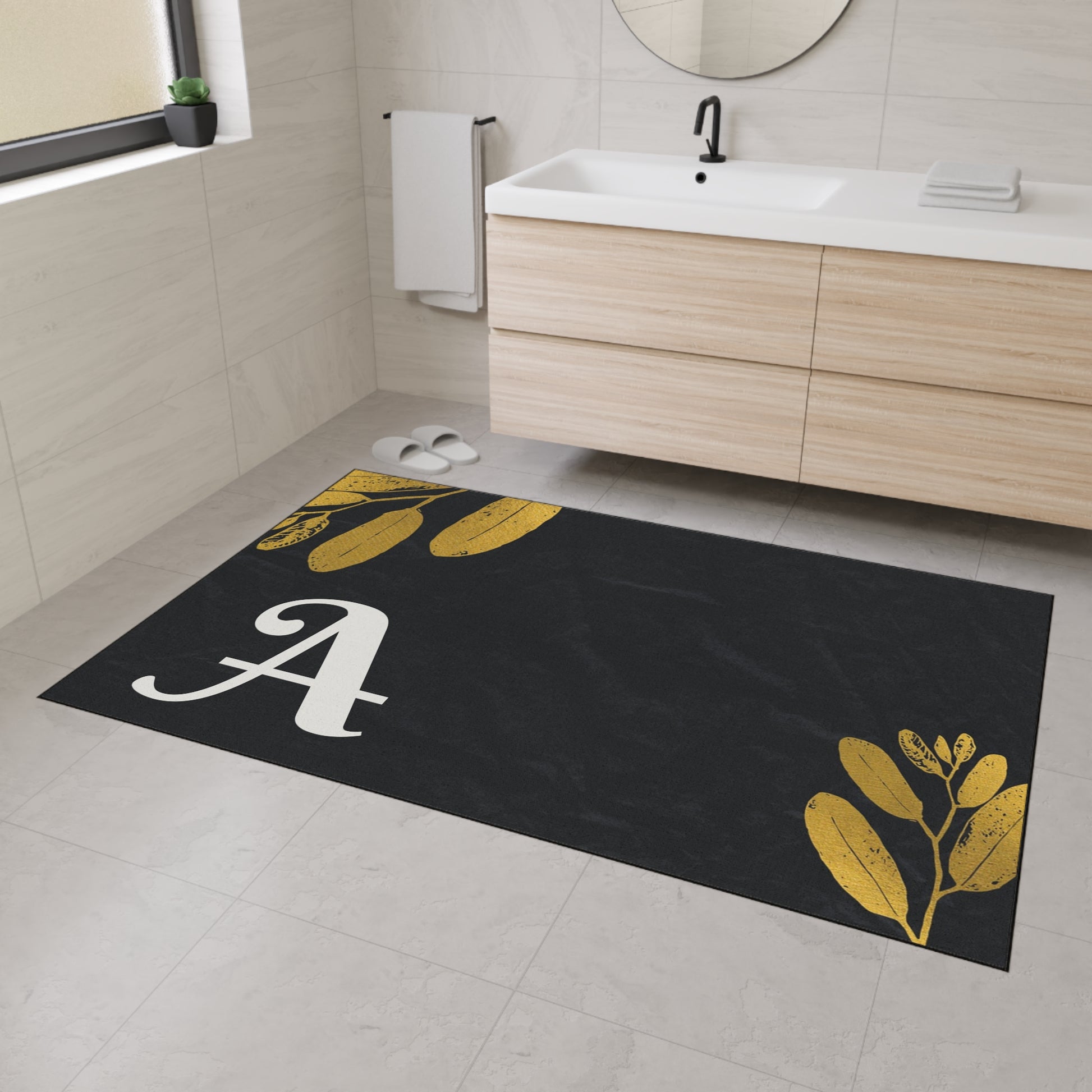A heavy-duty floor mat that brings quiet elegance to entryways, kitchens, or workspaces. The deep charcoal background and warm gold foliage create a calm, refined scene that settles the room as soon as you step inside. The single initial letter anchors the design — personal without being loud — and the textured polyester surface feels substantial underfoot while showing off crisp, saturated printing. Rubberized, non-slip backing grips tile, wood, or concrete so the mat stays put during daily traffic. It wears like it means business: resistant to abrasion and tearing, edged with black trim for a tidy, finished look. Assembled in the USA from globally sourced parts, this mat is for people who appreciate durable, thoughtfully designed pieces that age gracefully with daily life.