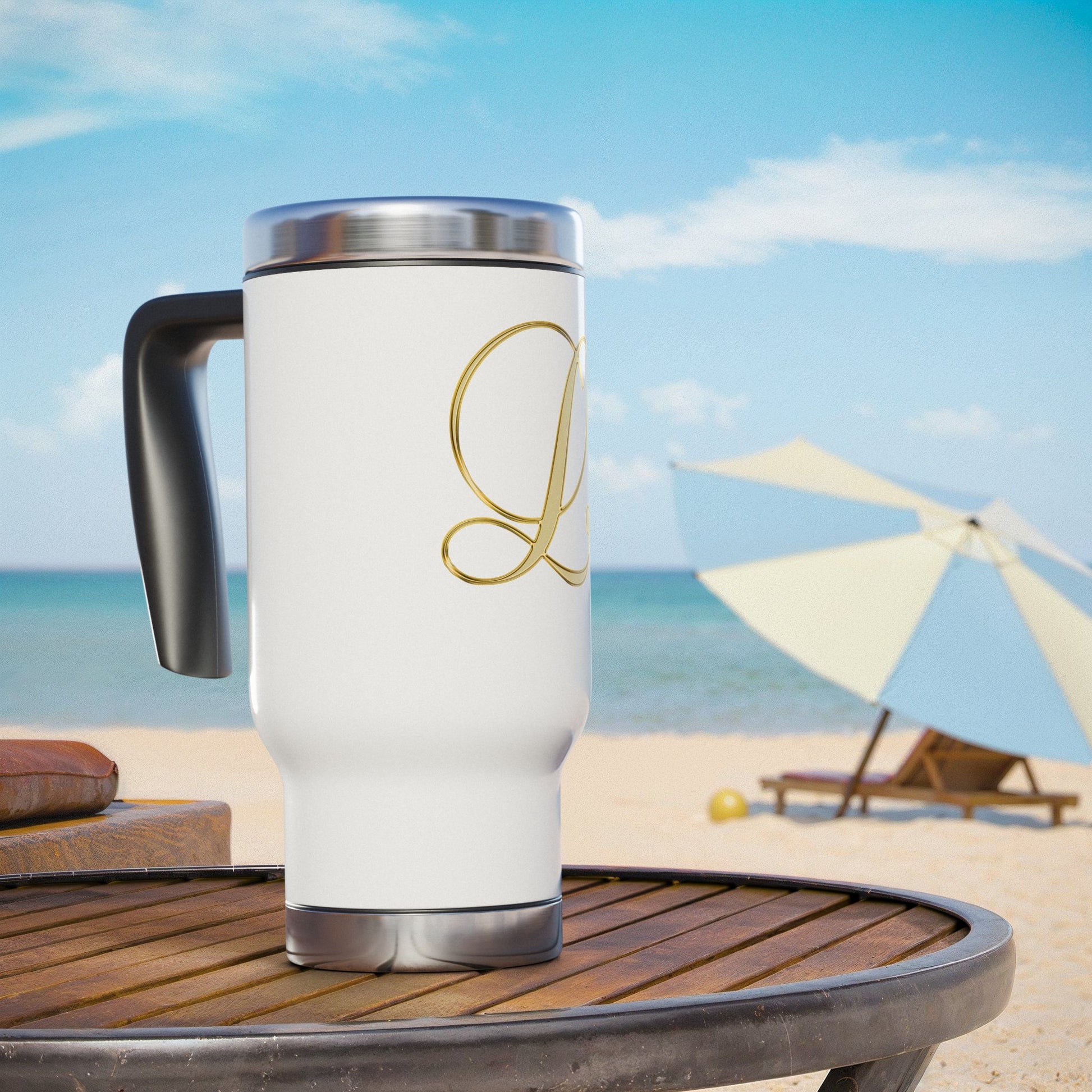 Monogram L Gold Travel Mug — 14oz Stainless Steel Tumbler with Handle
