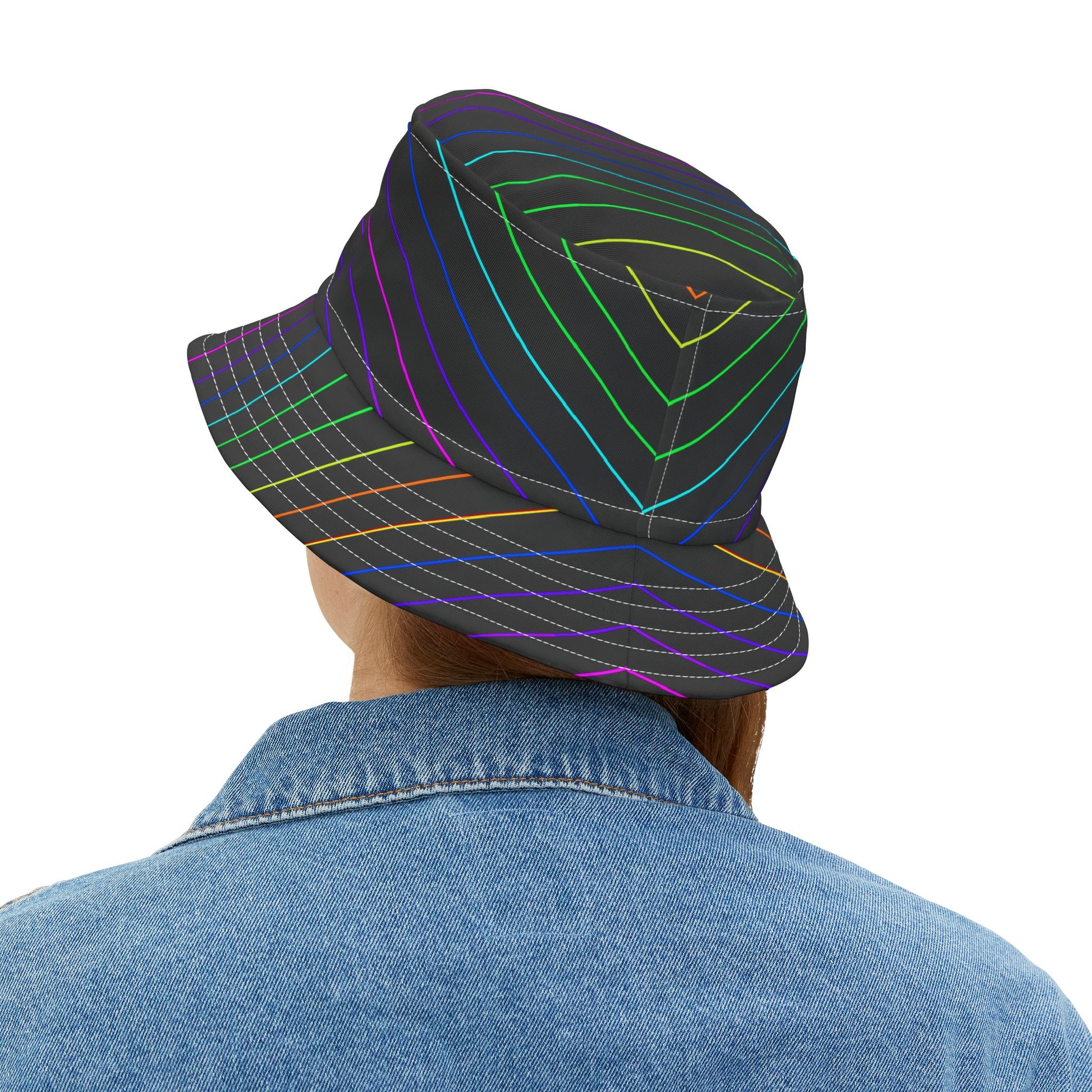 A lightweight, sculpted bucket hat with bold, rainbow-lined striping against a deep black field. The slim, colorful lines arc and grid across the crown and brim, giving it a modern, slightly retro rave energy. It sits low and casual, ready for long festival days, beachside sunsets, or city walks that turn into late-night detours. The polyester shell keeps the shape crisp while remaining easy to pack. Choose a stitching hue to subtly shift the hat’s accent tones, and pick the size that fits your head for all-day comfort. This hat reads like a statement accessory — playful, slightly nostalgic, and made to move with you.