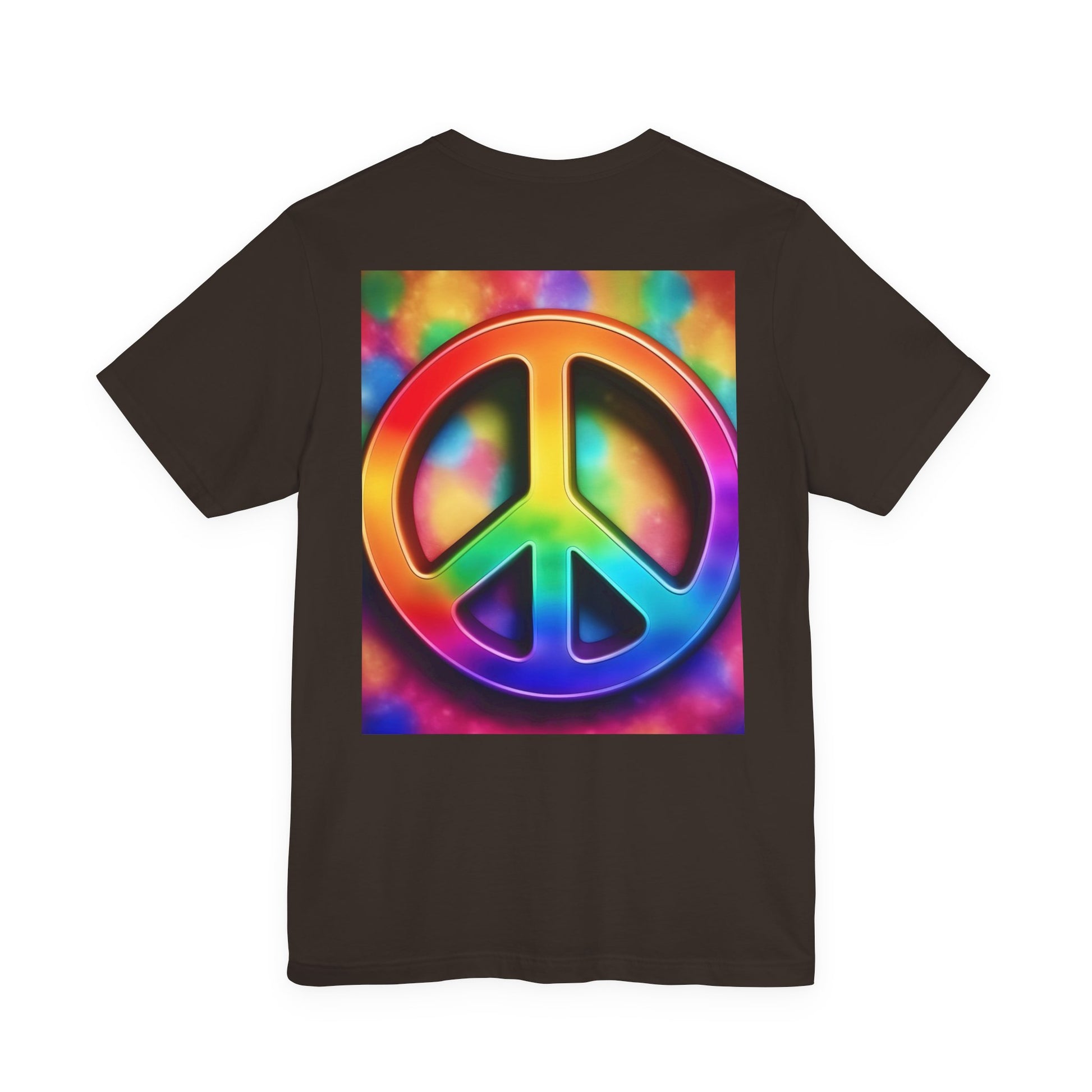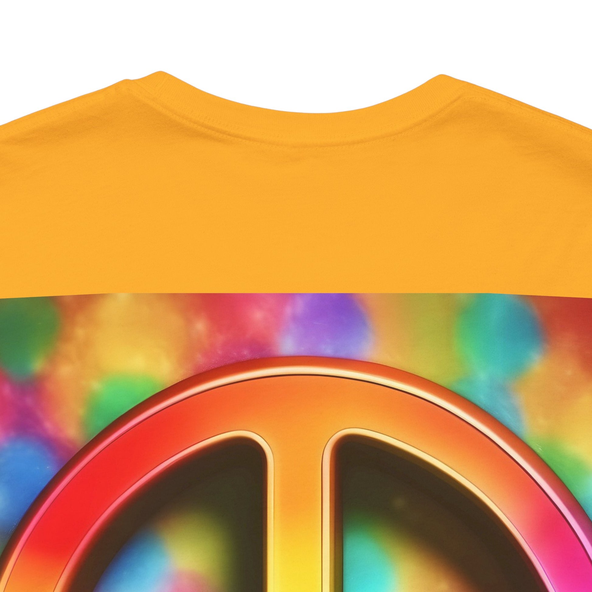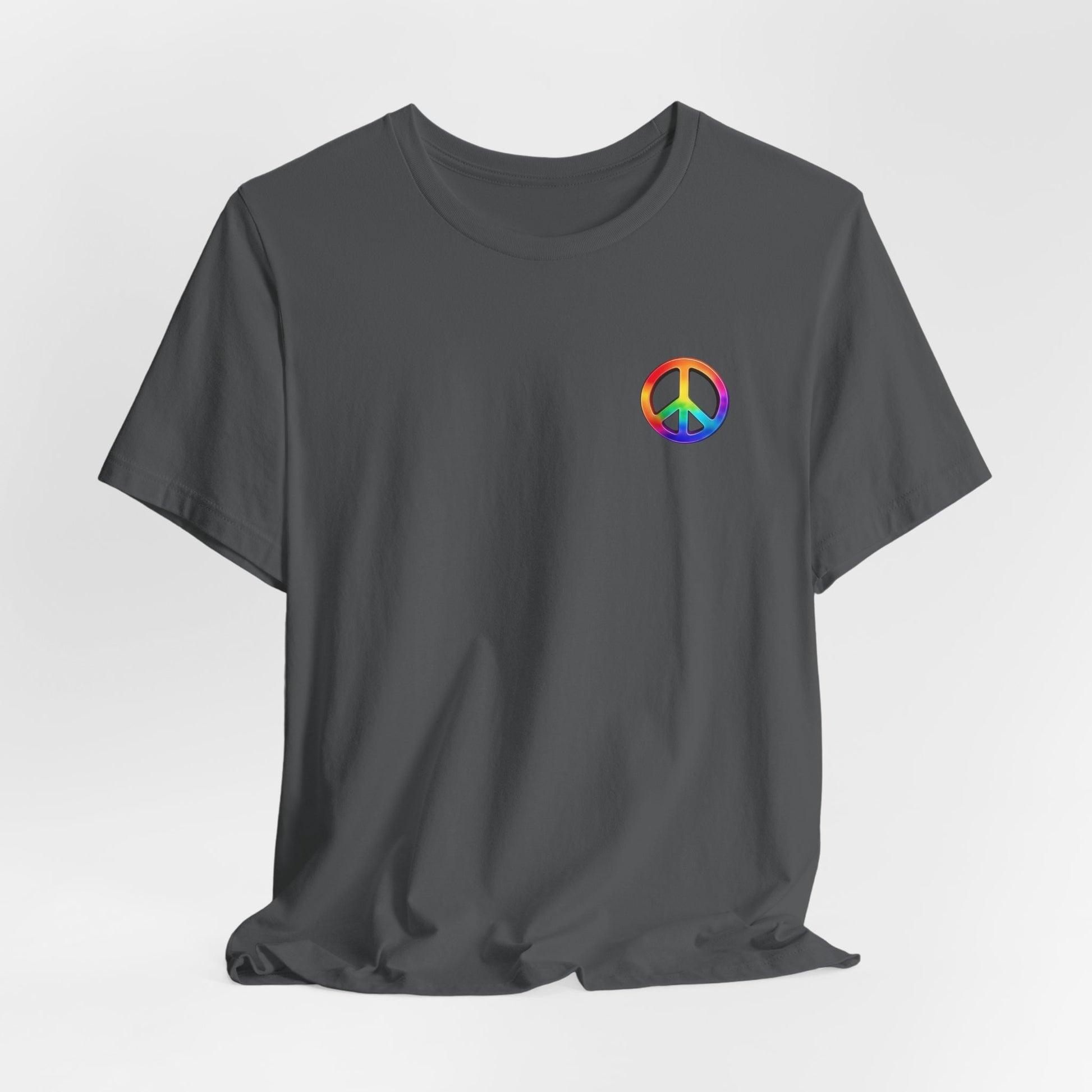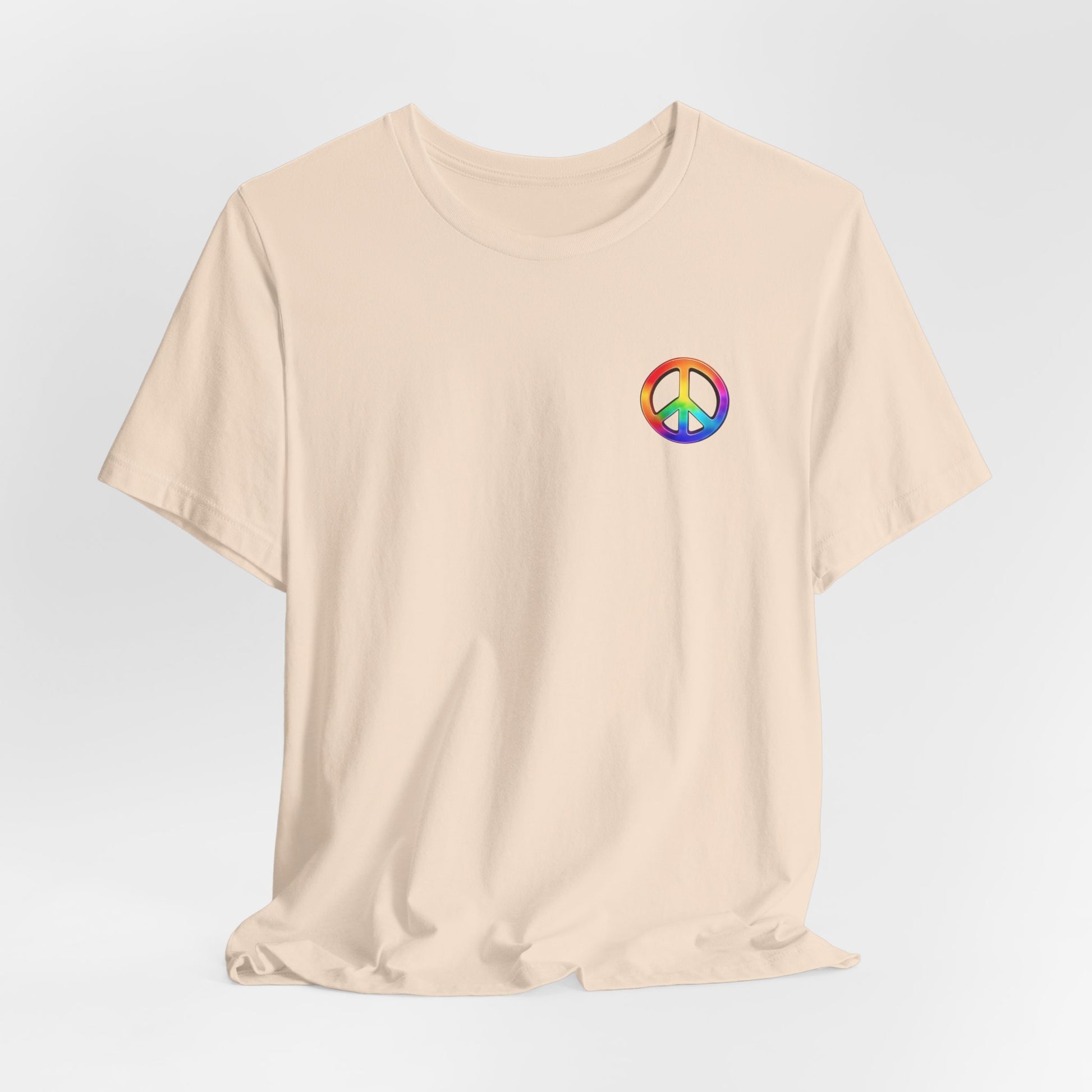 Soft, breathable tee built around a bold, retro-inspired peace emblem. The lightweight Airlume cotton feels cool against skin while the ribbed crew neck and shoulder tape keep the silhouette neat after many washes. A small rainbow peace mark over the heart and a large, saturated peace graphic across the back create a wearable statement—gentle, colorful, and unmistakably nostalgic. Wear it to backyard gatherings, music nights, or while wandering city streets to carry a quiet message of calm and community.