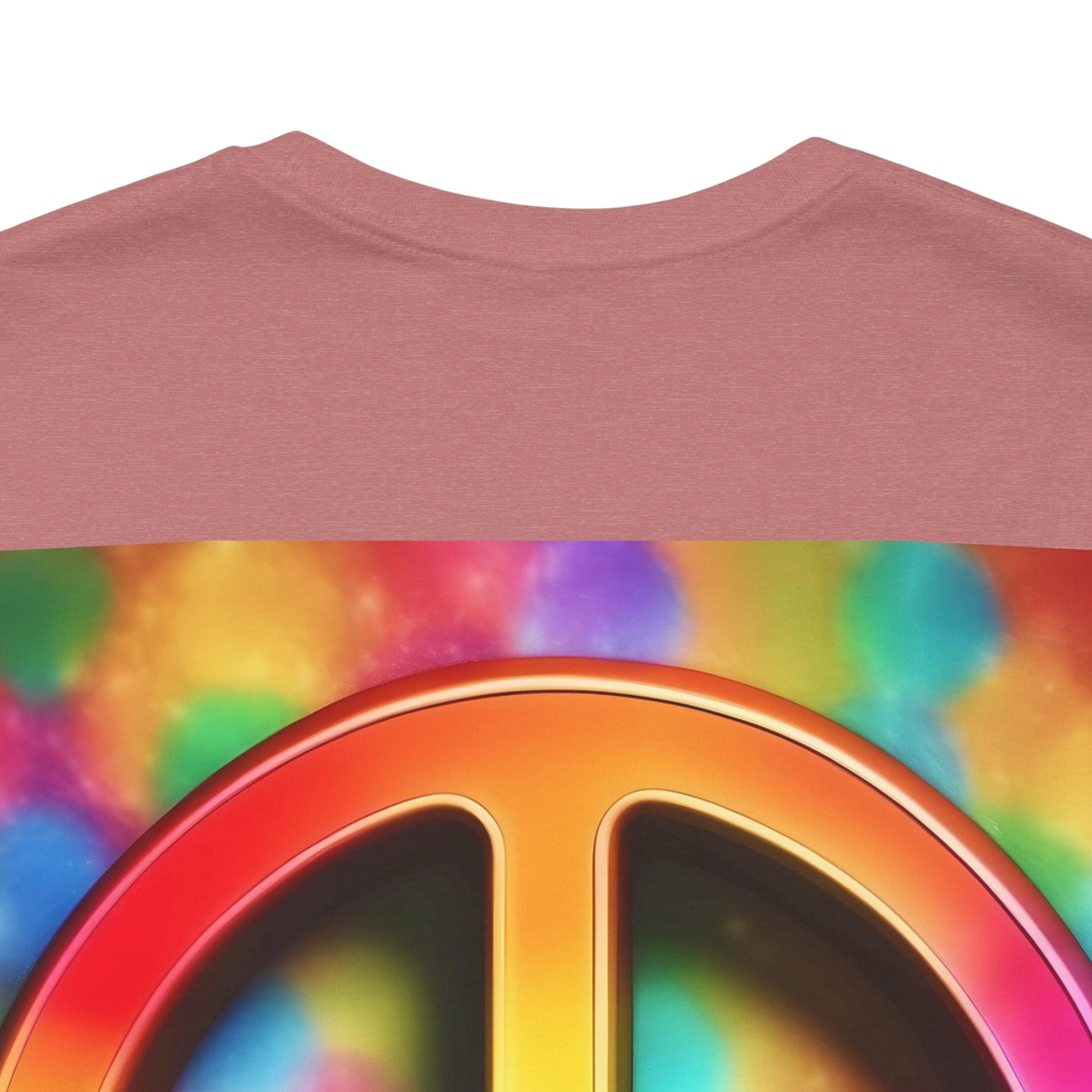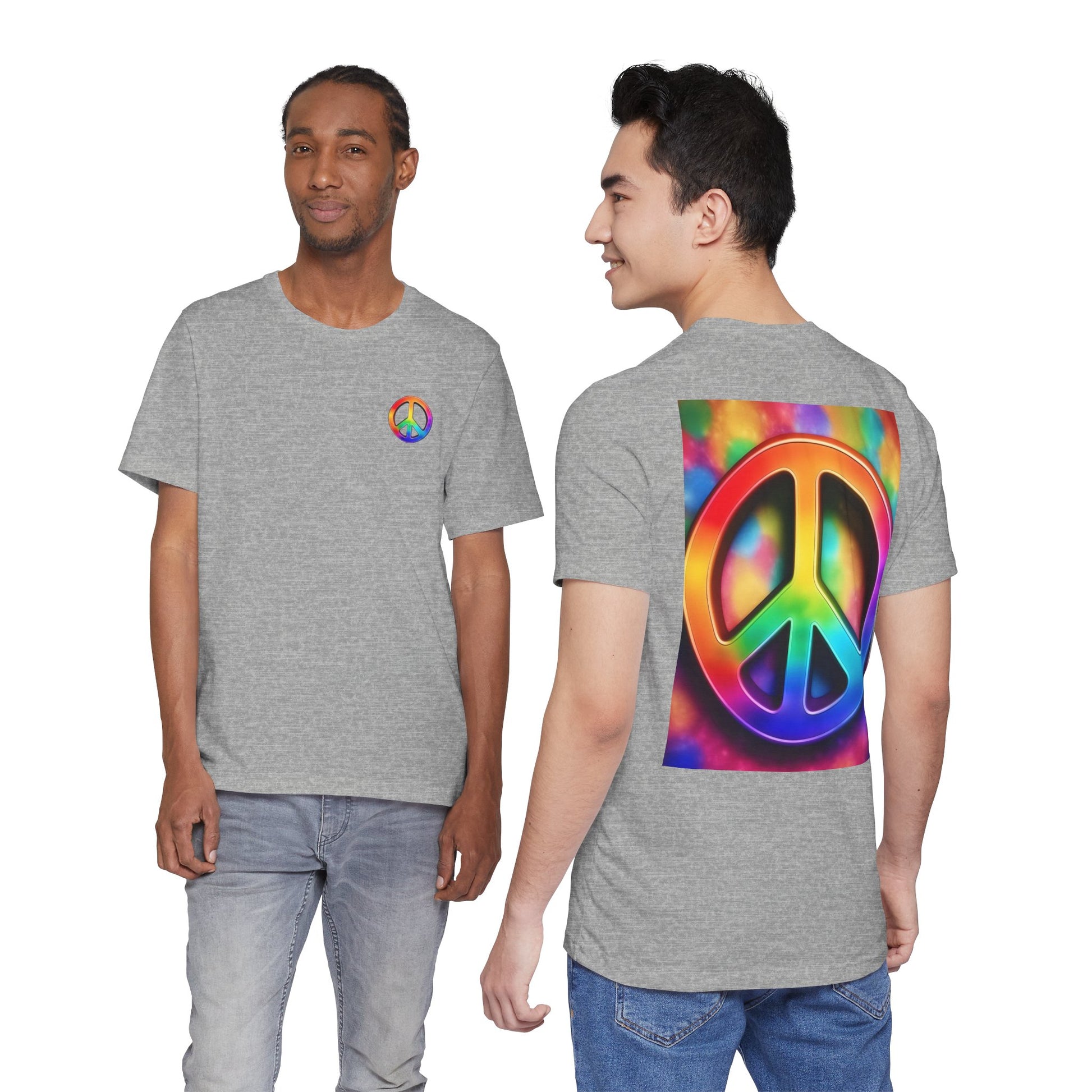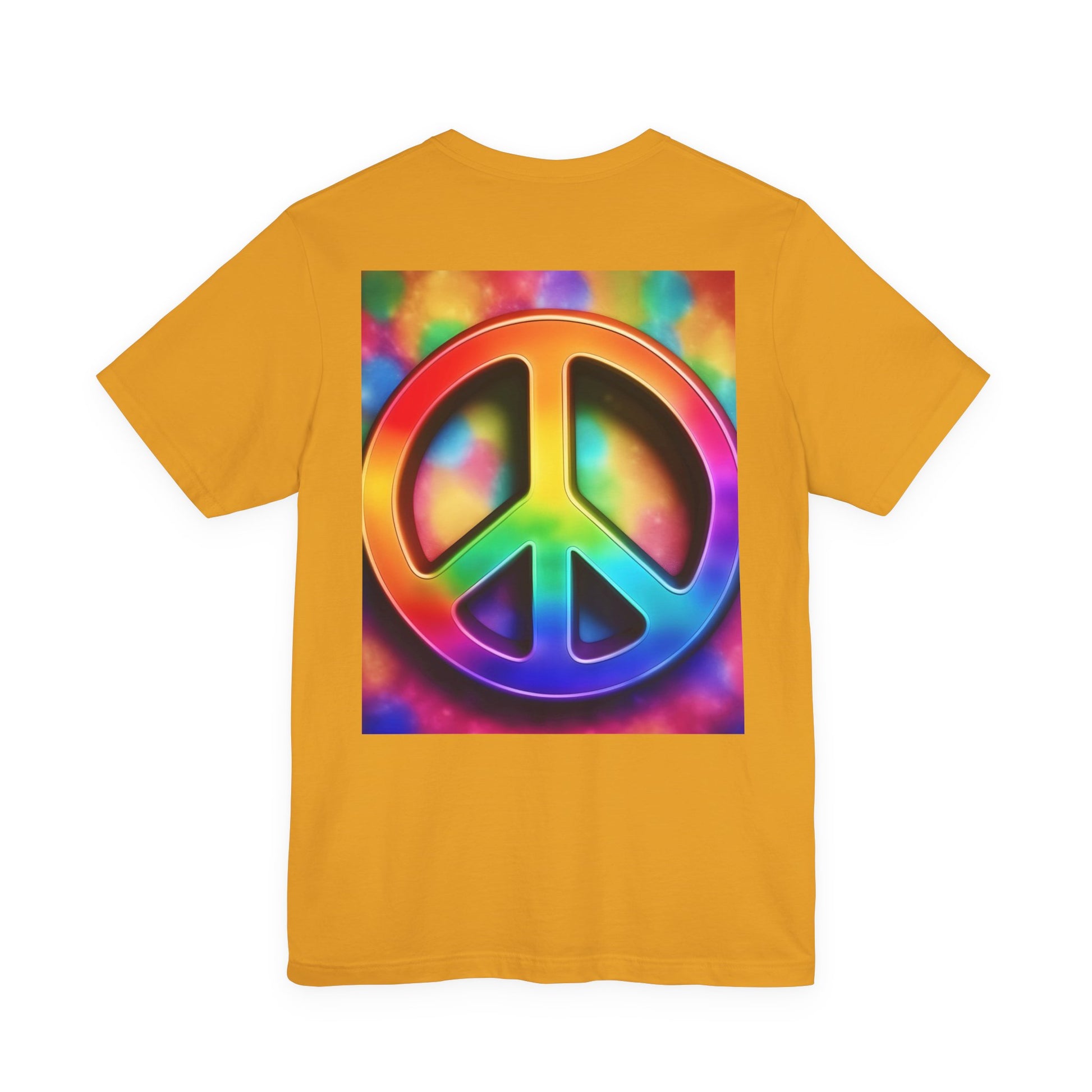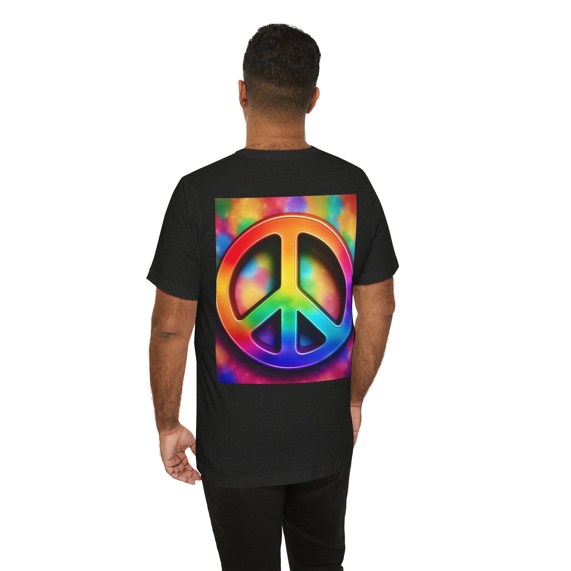 Soft, breathable tee built around a bold, retro-inspired peace emblem. The lightweight Airlume cotton feels cool against skin while the ribbed crew neck and shoulder tape keep the silhouette neat after many washes. A small rainbow peace mark over the heart and a large, saturated peace graphic across the back create a wearable statement—gentle, colorful, and unmistakably nostalgic. Wear it to backyard gatherings, music nights, or while wandering city streets to carry a quiet message of calm and community.