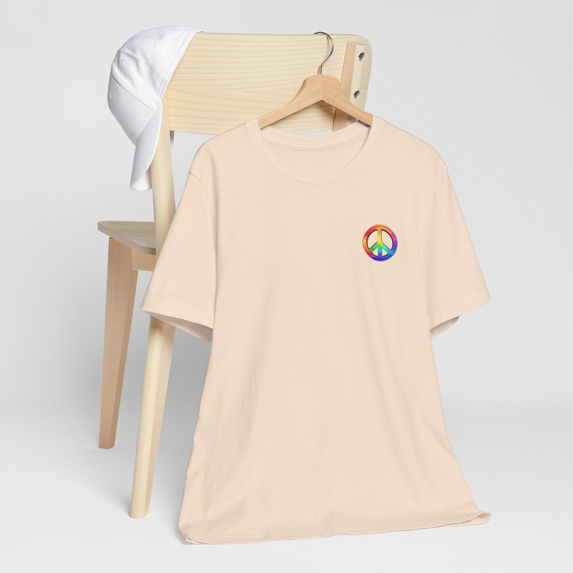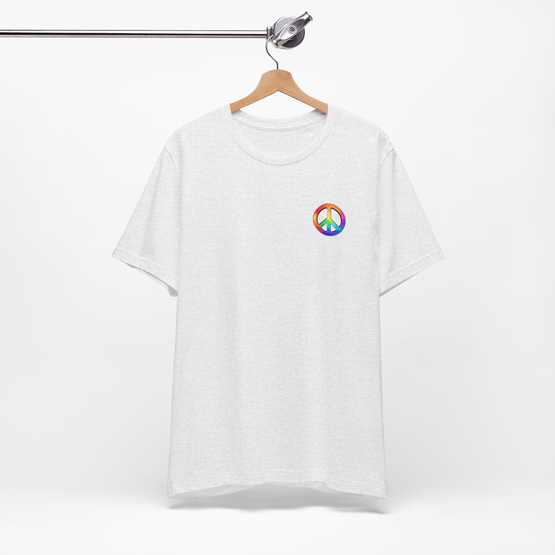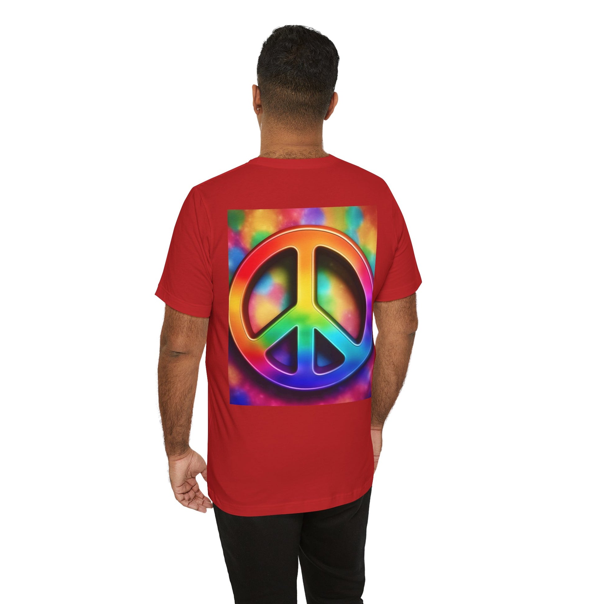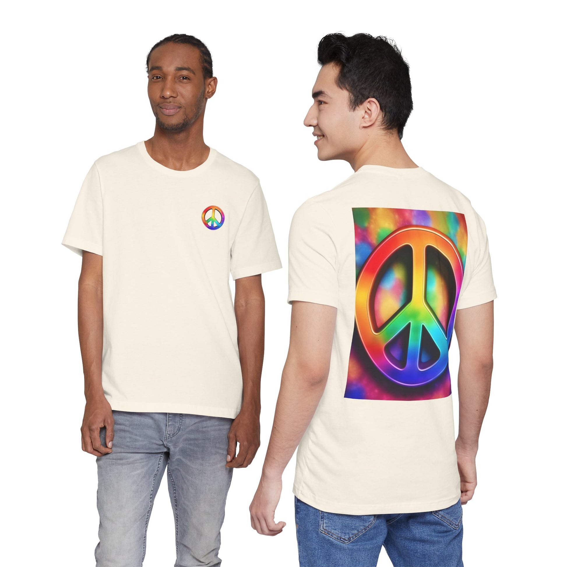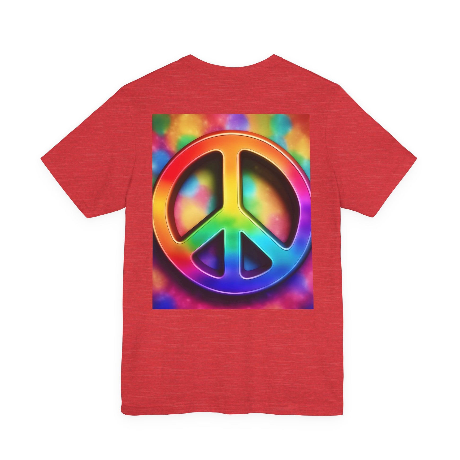 Soft, breathable tee built around a bold, retro-inspired peace emblem. The lightweight Airlume cotton feels cool against skin while the ribbed crew neck and shoulder tape keep the silhouette neat after many washes. A small rainbow peace mark over the heart and a large, saturated peace graphic across the back create a wearable statement—gentle, colorful, and unmistakably nostalgic. Wear it to backyard gatherings, music nights, or while wandering city streets to carry a quiet message of calm and community.