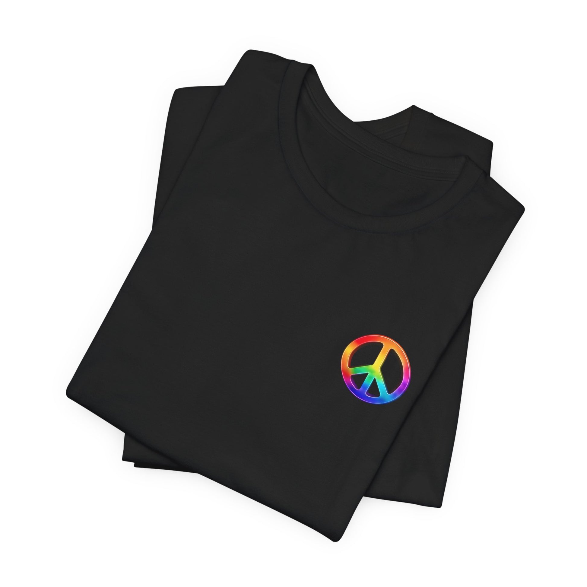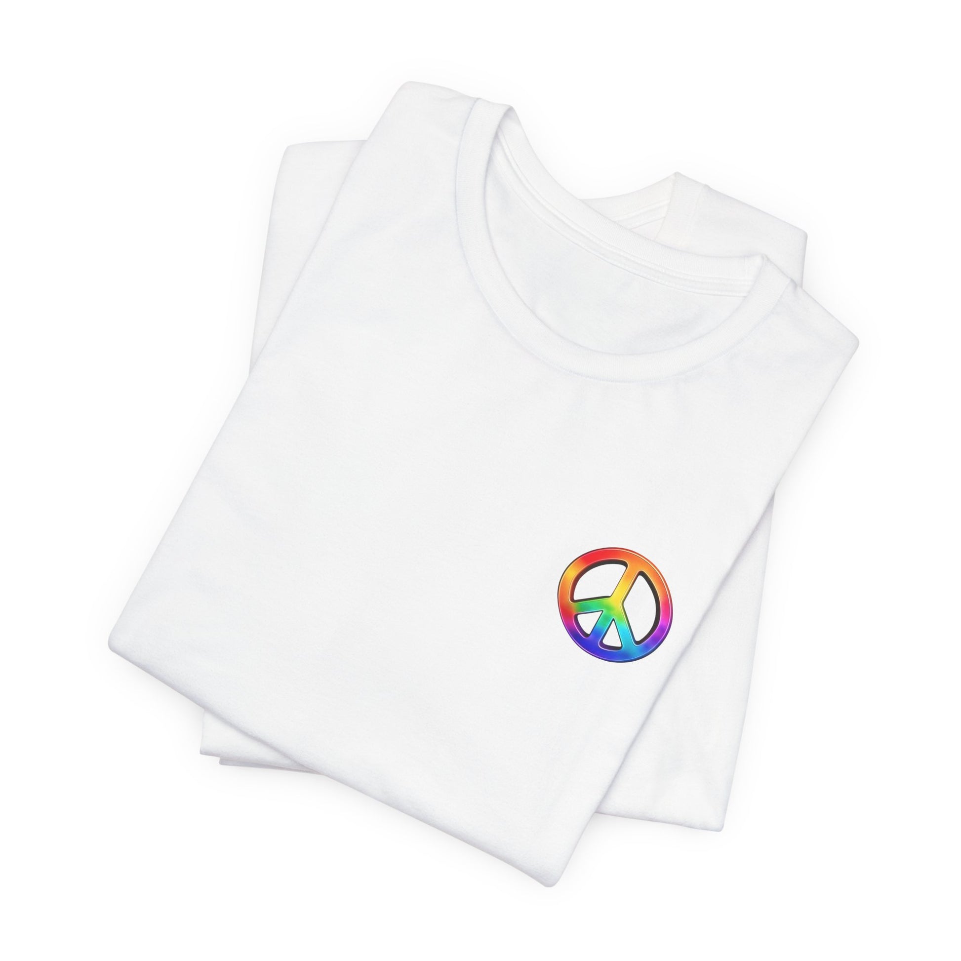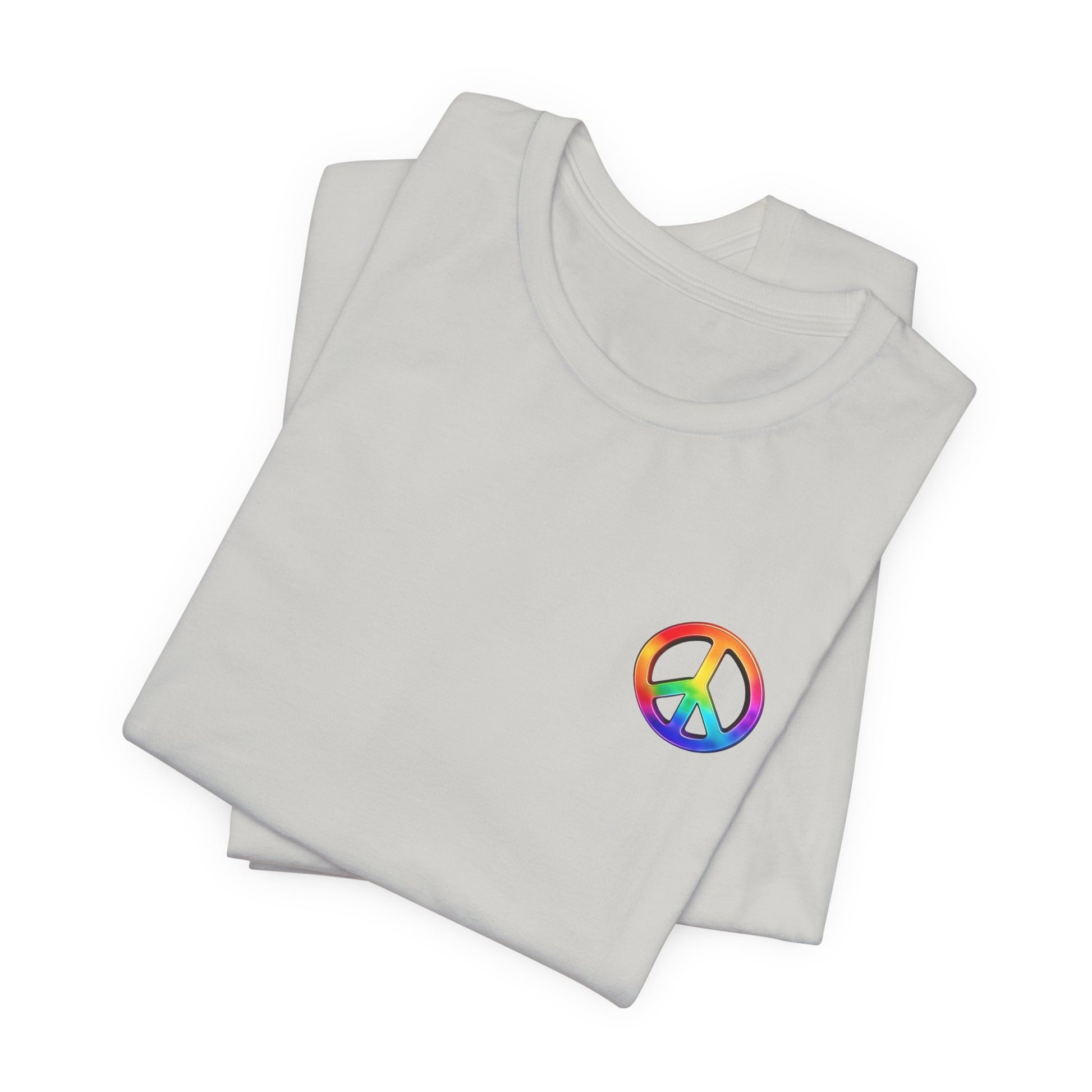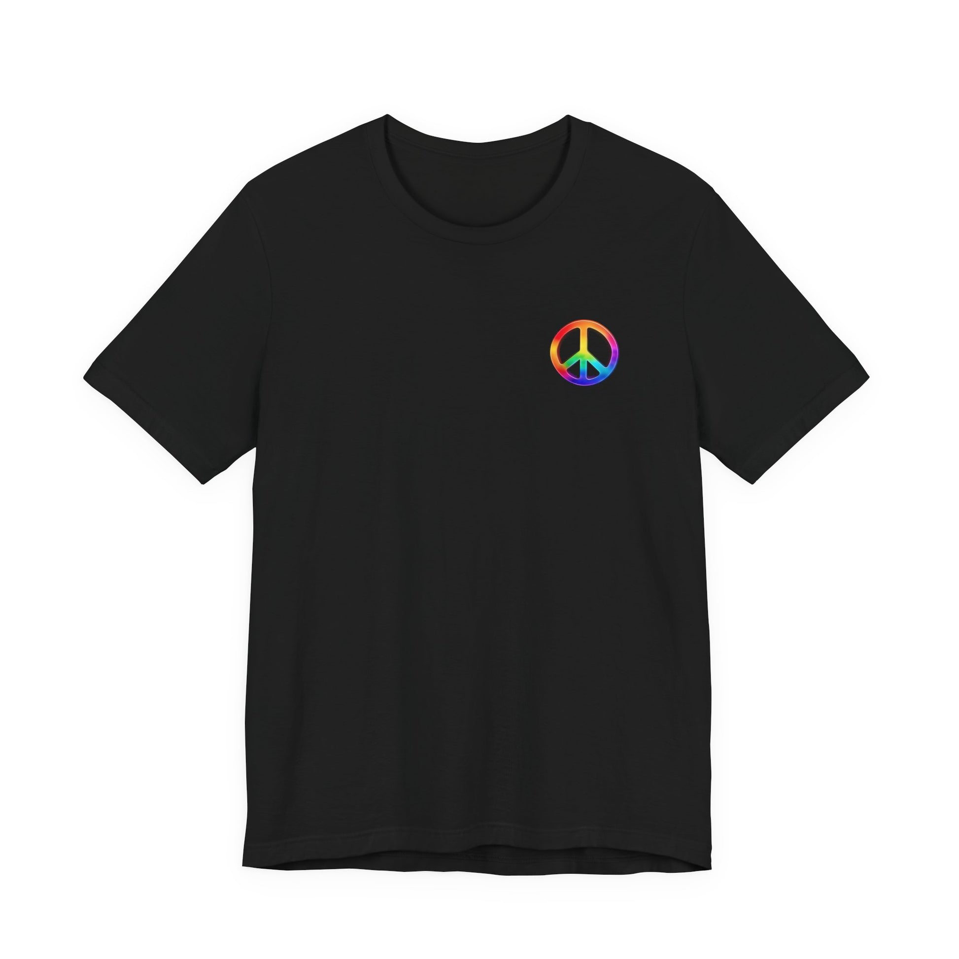 Soft, breathable tee built around a bold, retro-inspired peace emblem. The lightweight Airlume cotton feels cool against skin while the ribbed crew neck and shoulder tape keep the silhouette neat after many washes. A small rainbow peace mark over the heart and a large, saturated peace graphic across the back create a wearable statement—gentle, colorful, and unmistakably nostalgic. Wear it to backyard gatherings, music nights, or while wandering city streets to carry a quiet message of calm and community.