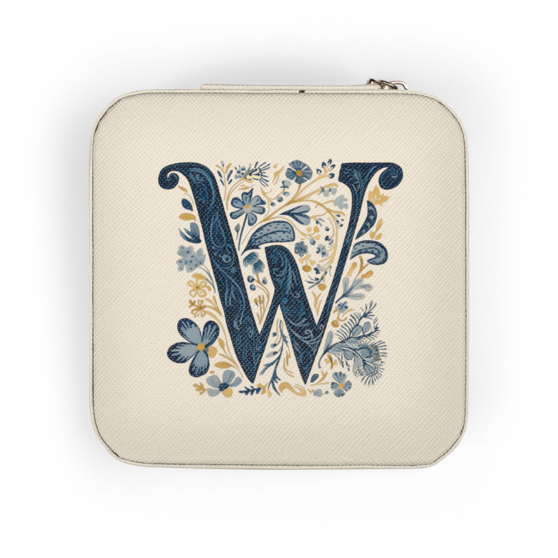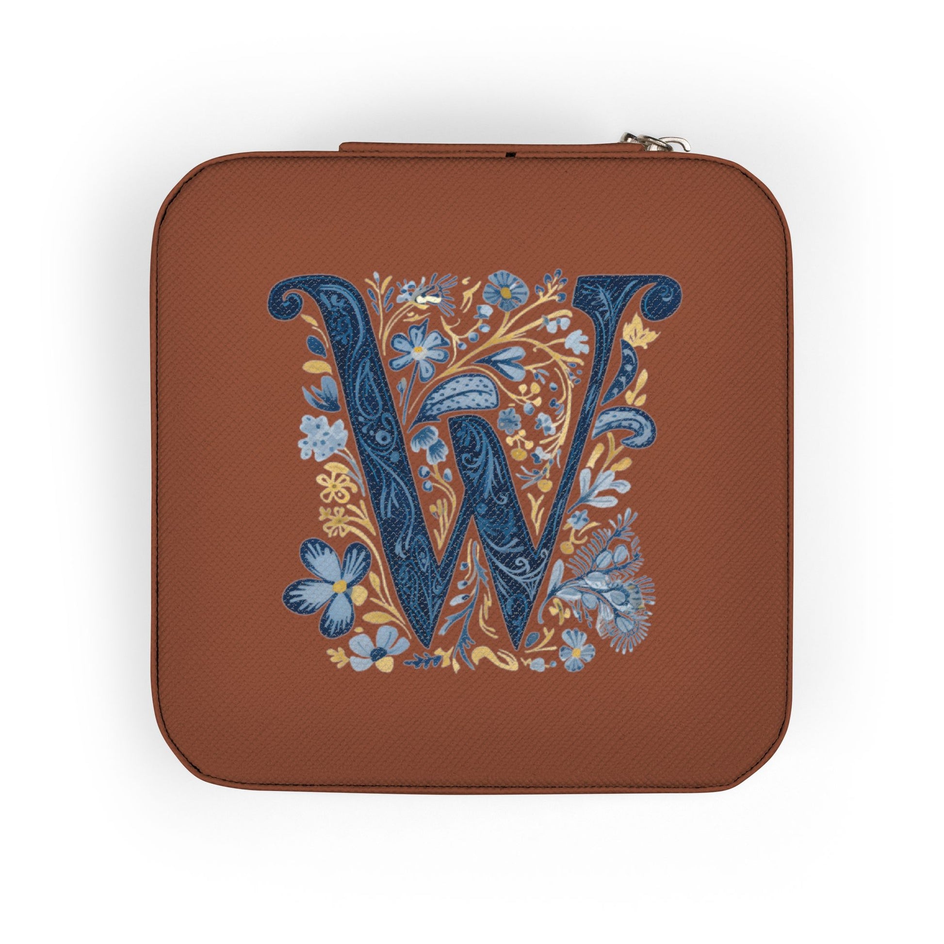 A compact, elegant jewelry travel case designed to keep treasured pieces safe and ready to wear. The soft PU leather exterior and plush interior cushion rings, studs, and necklaces while the divided compartments and roll sections keep everything visible and untangled. The square zip-around design holds items securely in place during transit, and the UV-printed floral-initial artwork adds a personal, artisanal touch. Small enough to slip into a purse or carry-on, this case brings calm organization to busy travel routines and everyday outings.