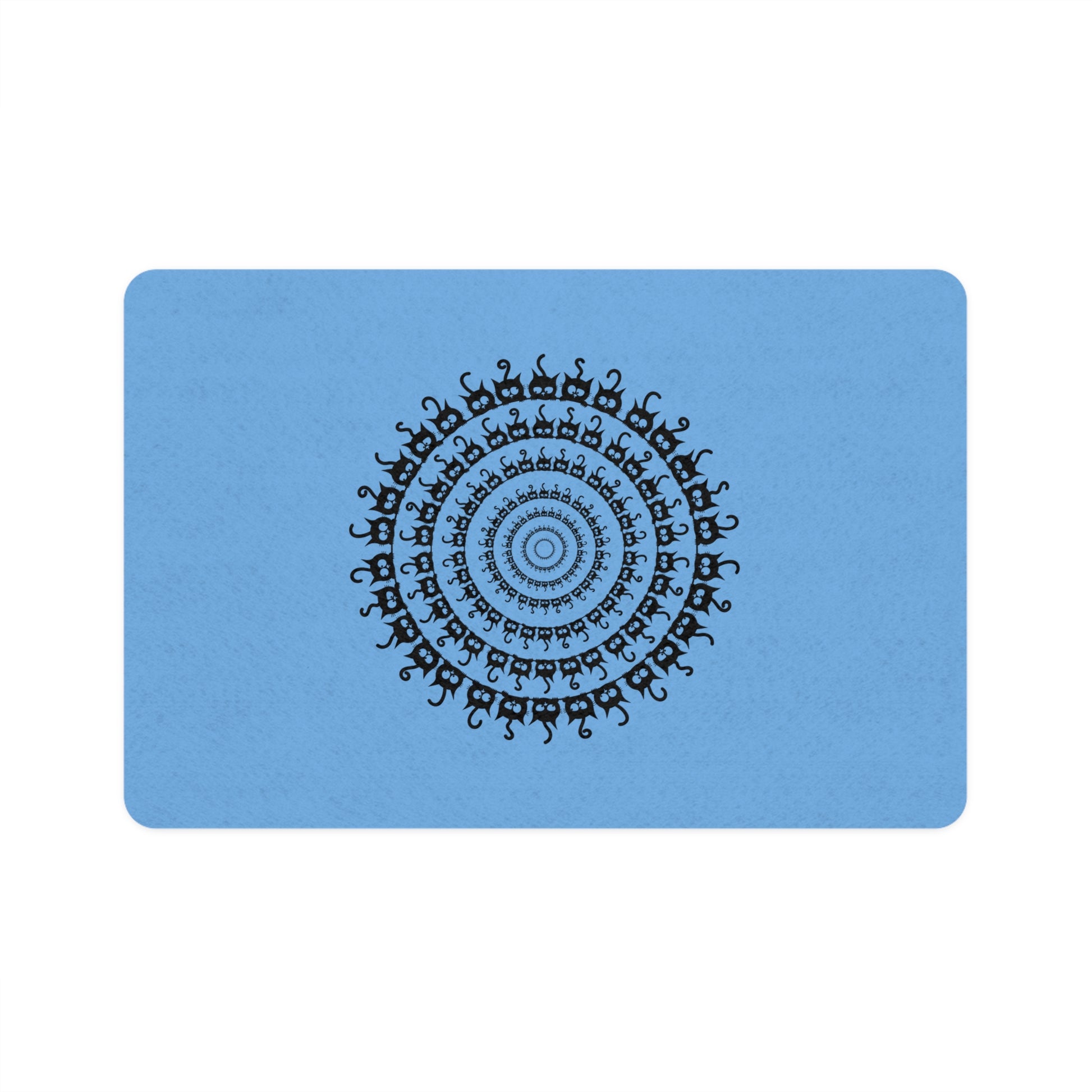 A calming, functional pet food mat that brings a little ritual to mealtime. The soft blue surface features a centered mandala-like ring of playful paw and chair motifs in deep charcoal — a subtle, meditative focal point that helps keep bowls in place and spills contained. Lightweight and quick-drying, the polyester top resists stains and retains vivid color, while the neoprene rubber backing grips floors so energetic eaters can’t slide their dishes around. Lay it down for everyday feeding, for a quiet moment before walks, or to brighten up a kitchen corner without shouting for attention.