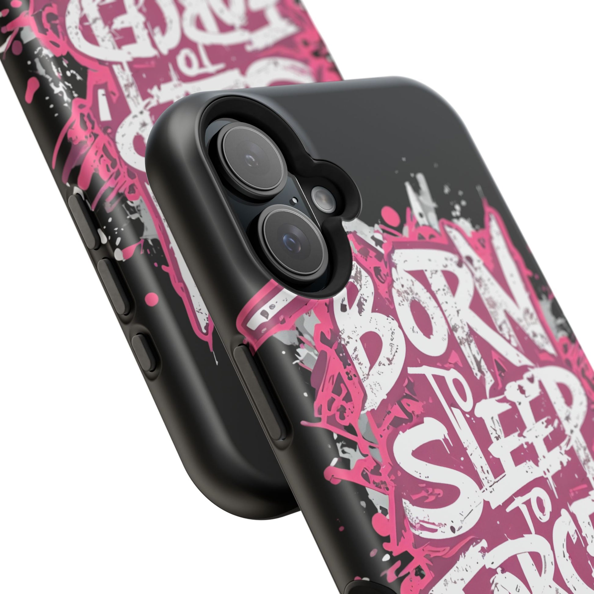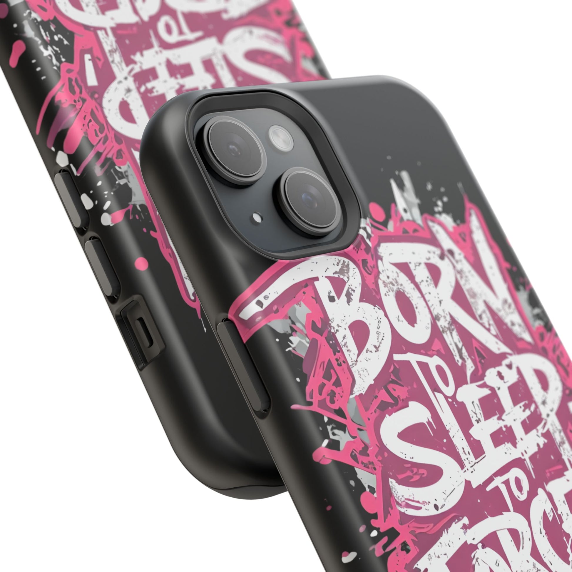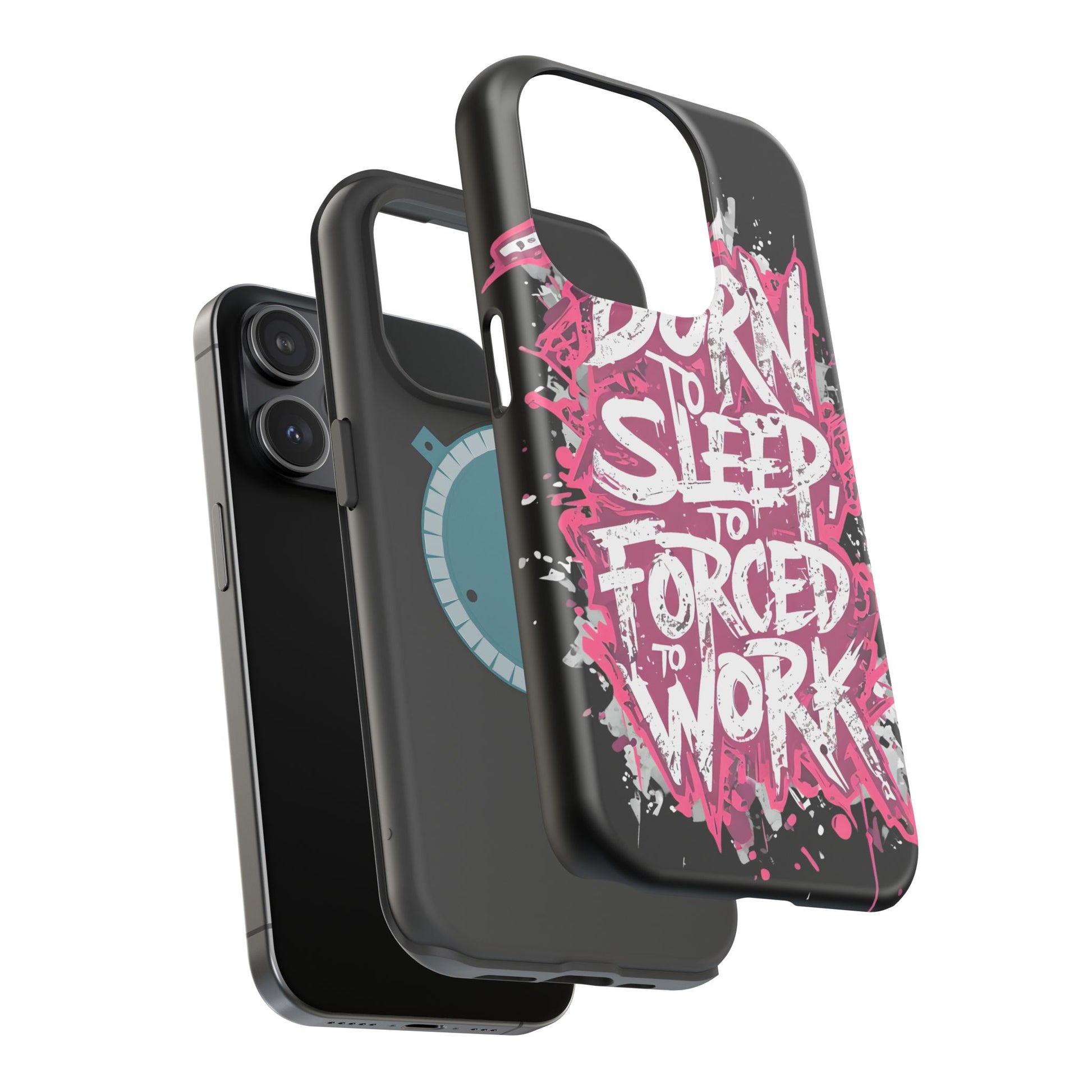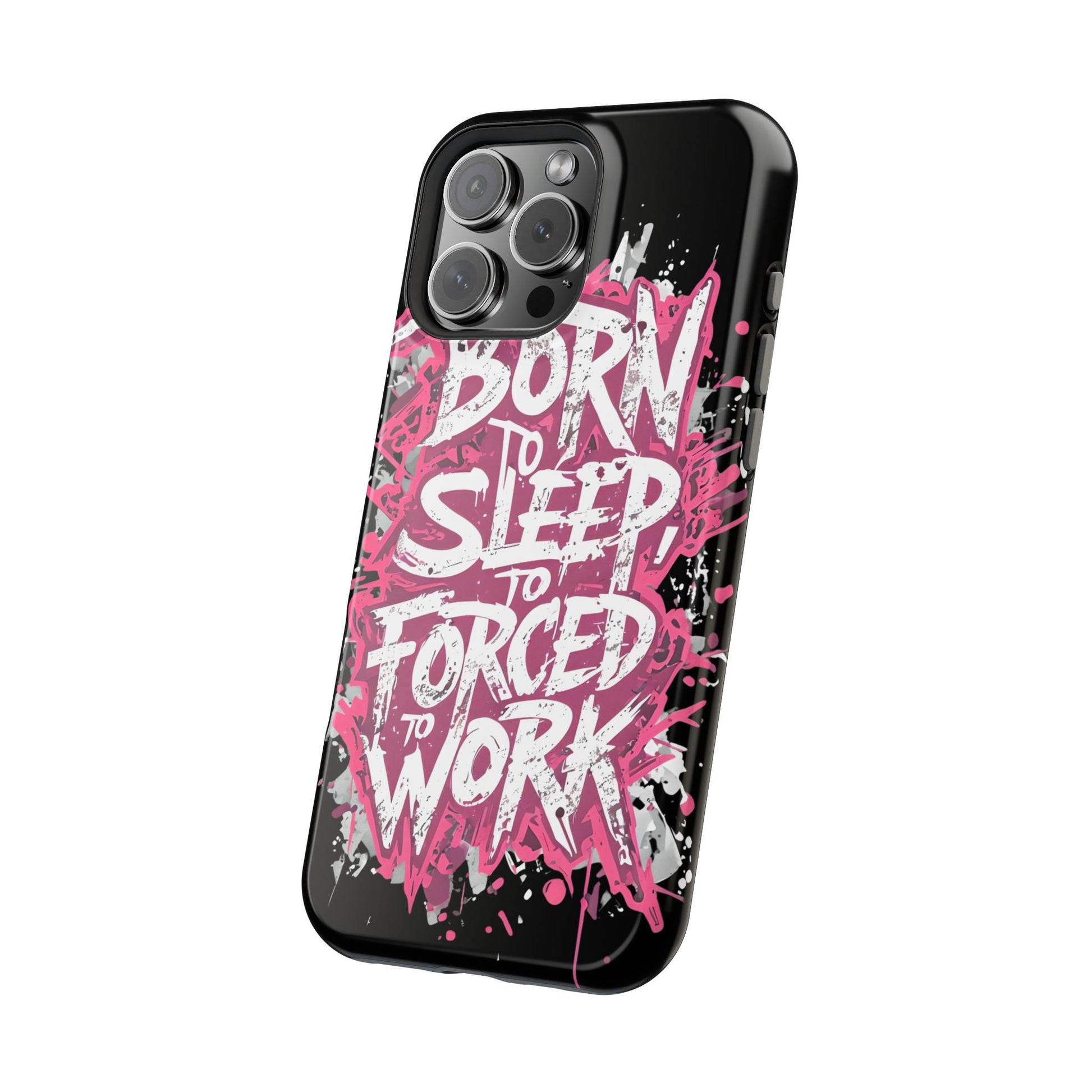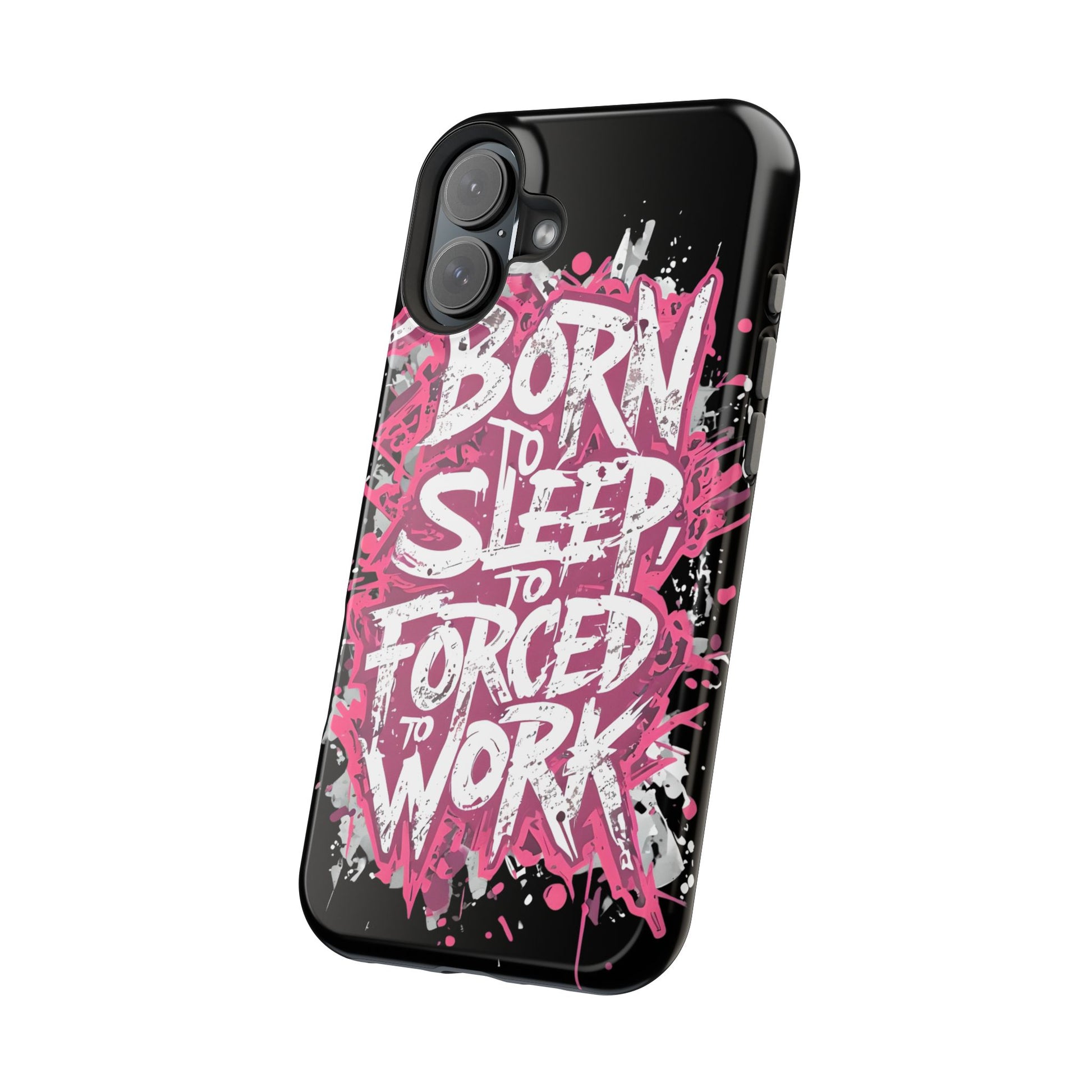 This protective phone case brings bold attitude to your daily carry. A gritty graffiti-style design — hot pink splatters and jagged white lettering that reads “BORN TO SLEEP TO FORCED TO WORK” — turns your device into a statement piece. The rigid polycarbonate shell and cushioned TPU liner work together to resist scratches and light impacts while maintaining a slim profile. Interior magnets add MagSafe compatibility so the case plays nicely with chargers and accessories. Choose glossy for eye-catching shine or matte for a stealthy, velvety finish. It’s made for adults who want their phone protection to reflect a wry, rebellious sense of humor and city-street energy.