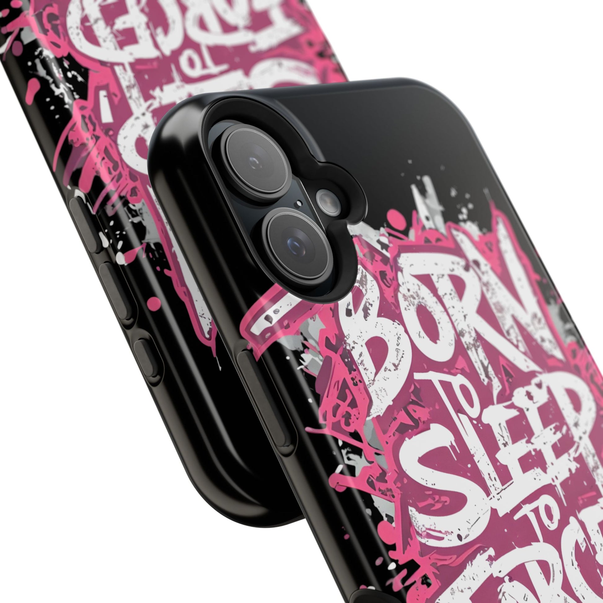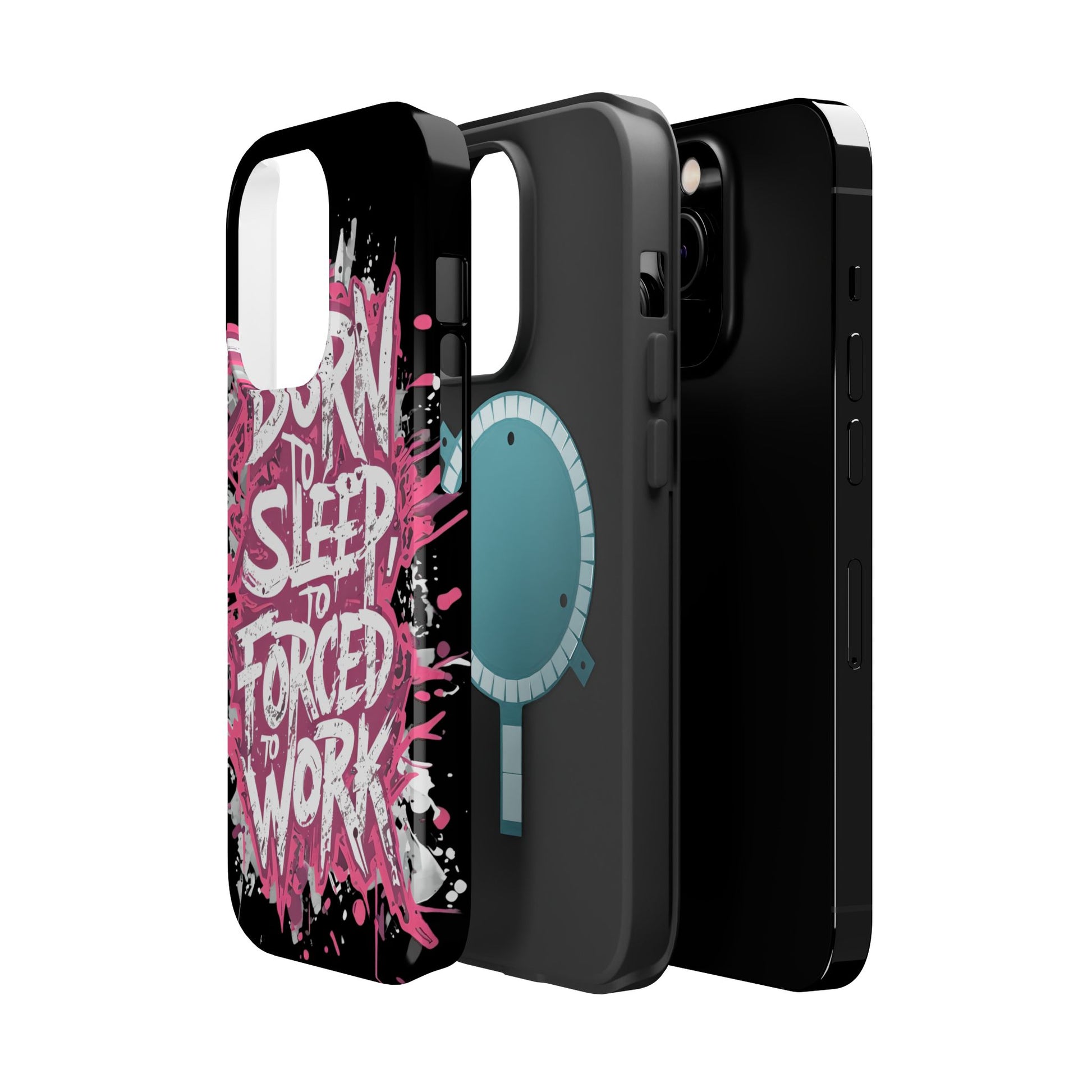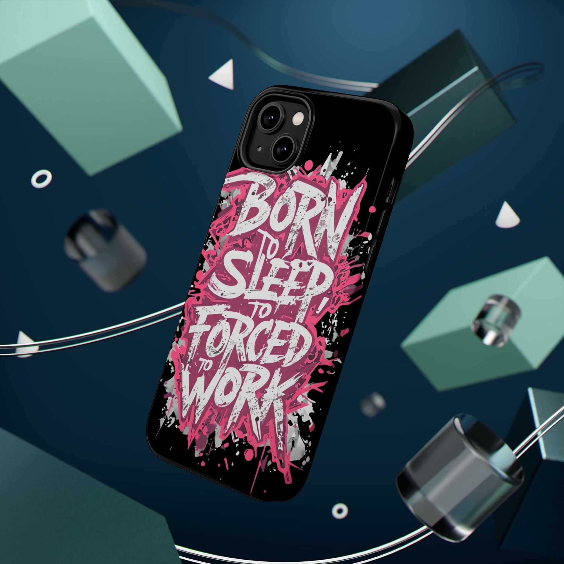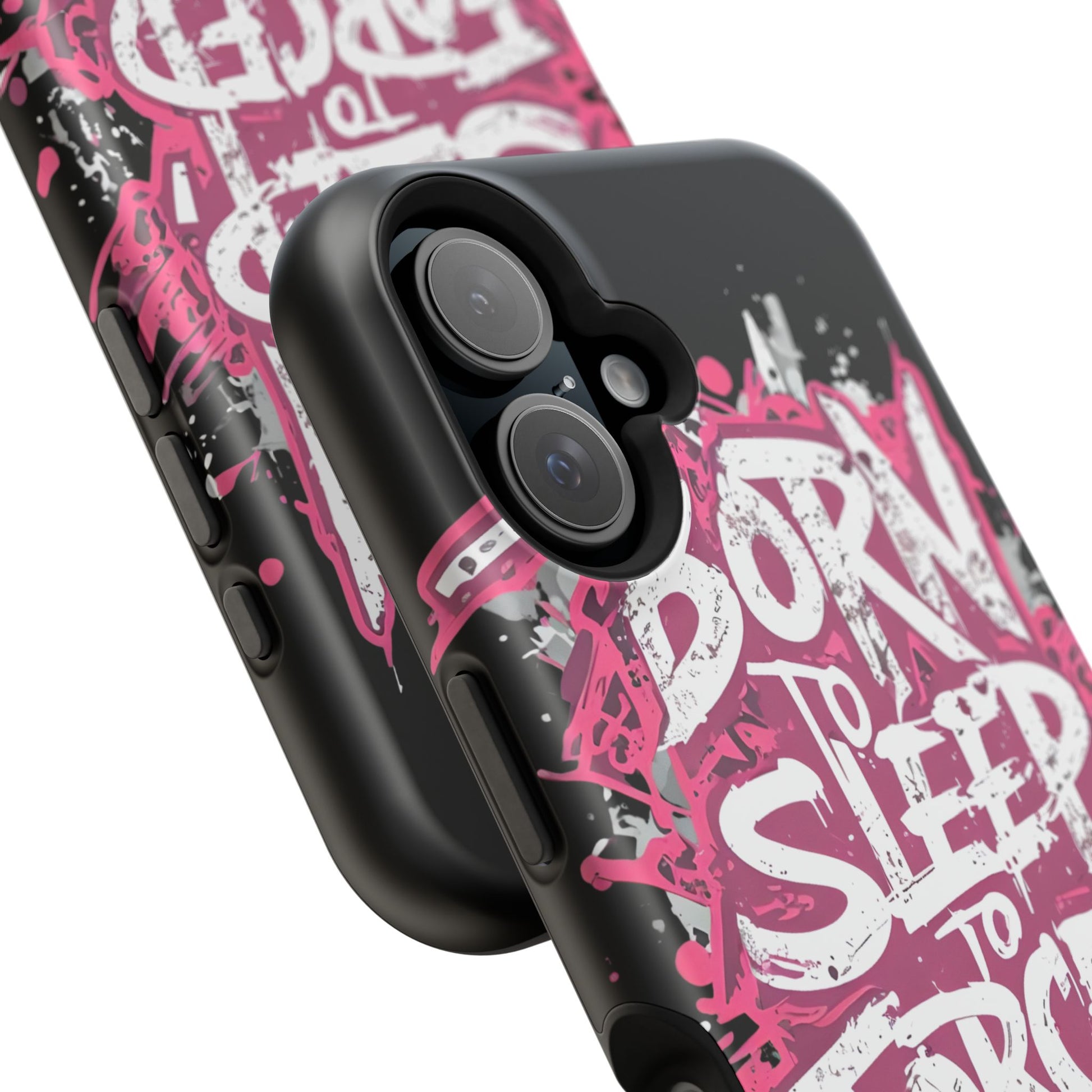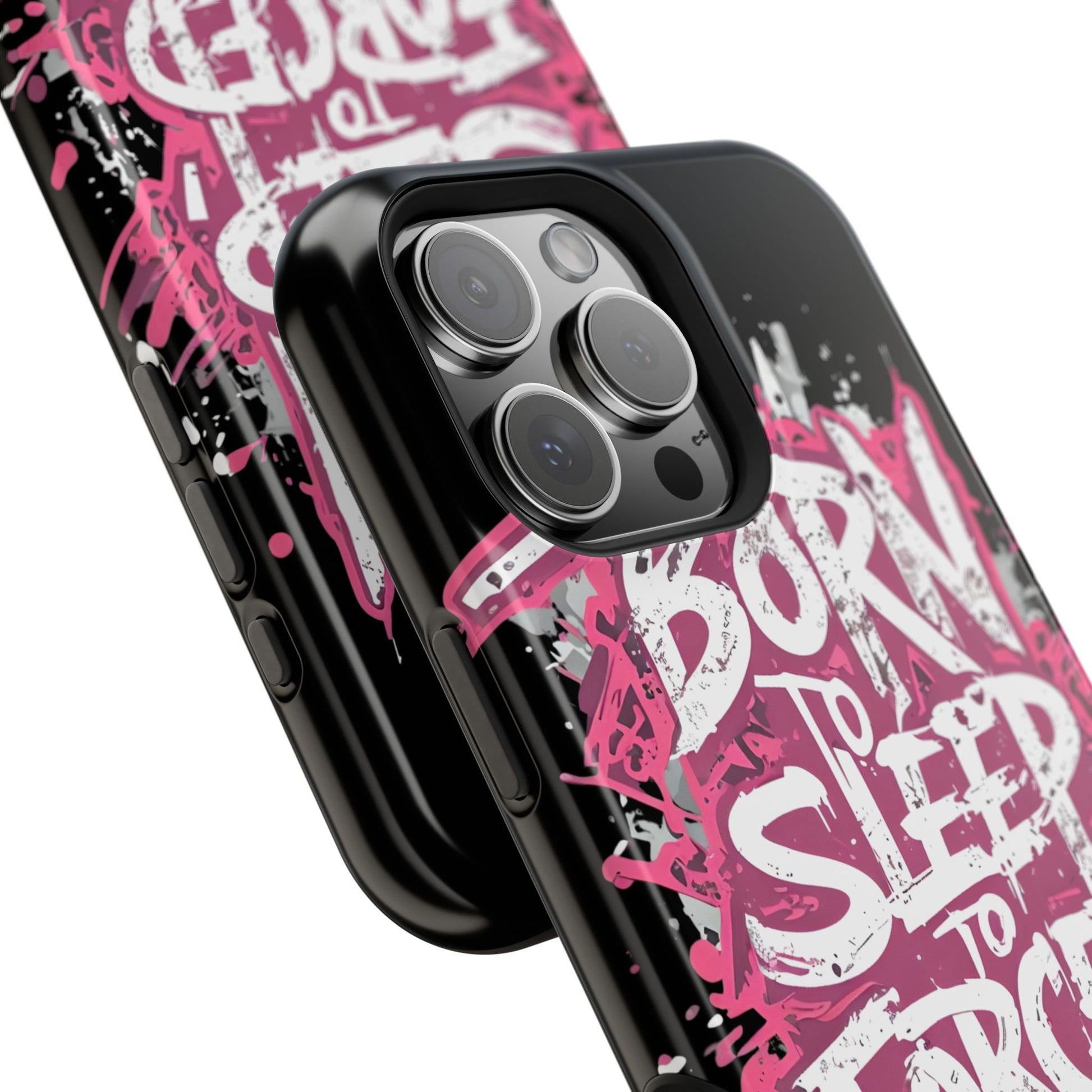 This protective phone case brings bold attitude to your daily carry. A gritty graffiti-style design — hot pink splatters and jagged white lettering that reads “BORN TO SLEEP TO FORCED TO WORK” — turns your device into a statement piece. The rigid polycarbonate shell and cushioned TPU liner work together to resist scratches and light impacts while maintaining a slim profile. Interior magnets add MagSafe compatibility so the case plays nicely with chargers and accessories. Choose glossy for eye-catching shine or matte for a stealthy, velvety finish. It’s made for adults who want their phone protection to reflect a wry, rebellious sense of humor and city-street energy.