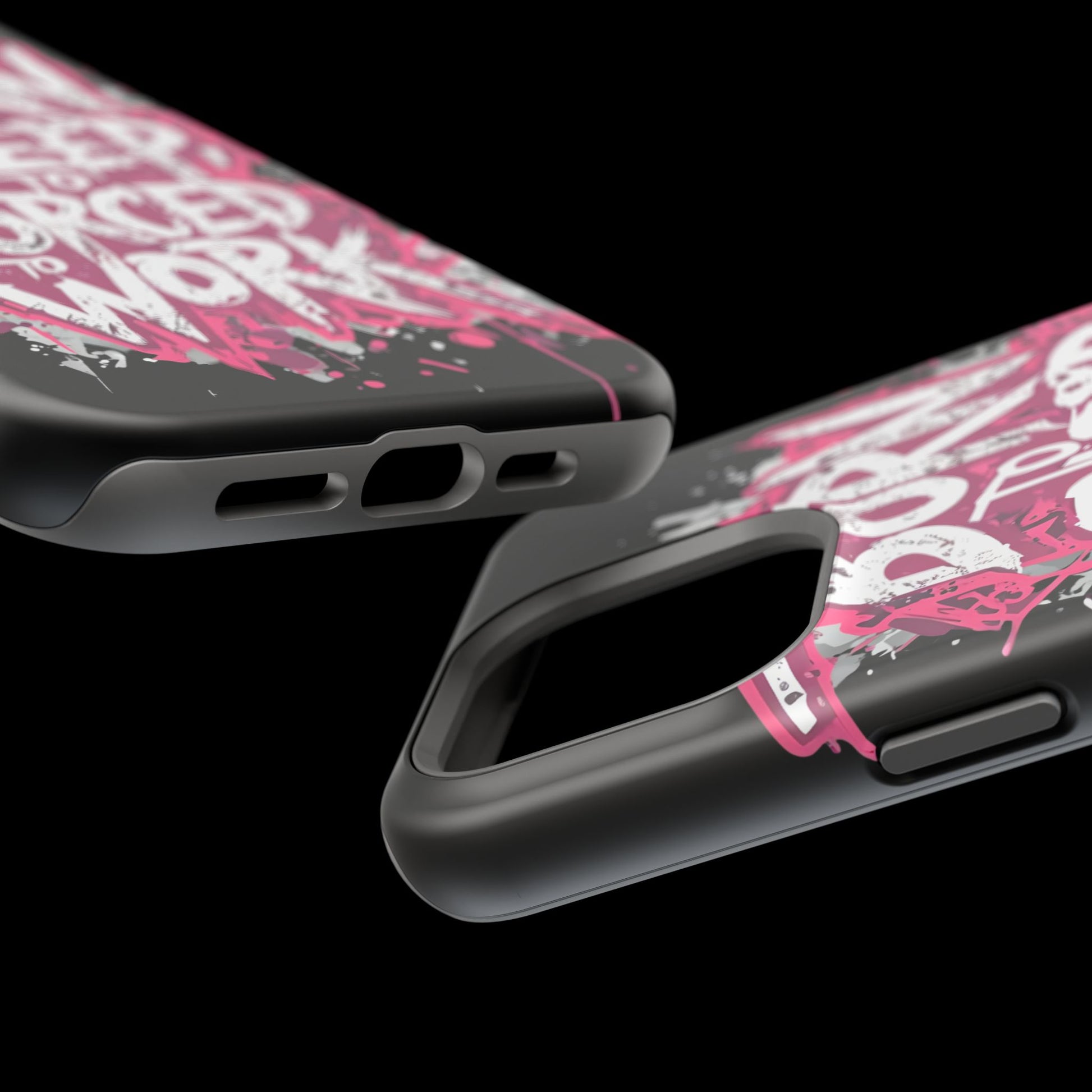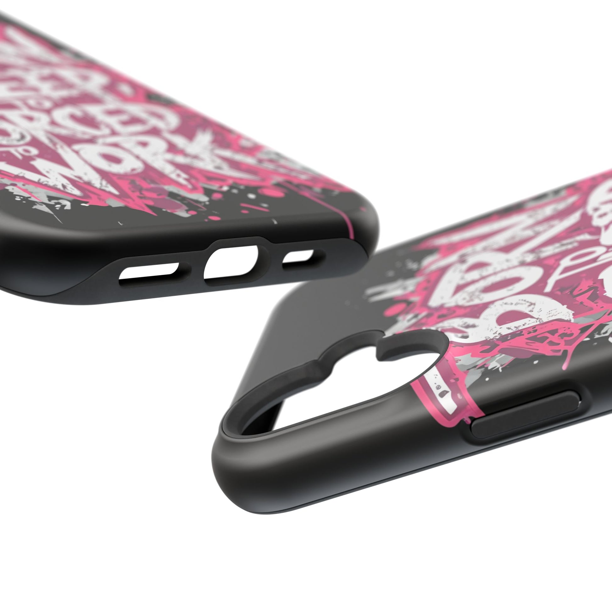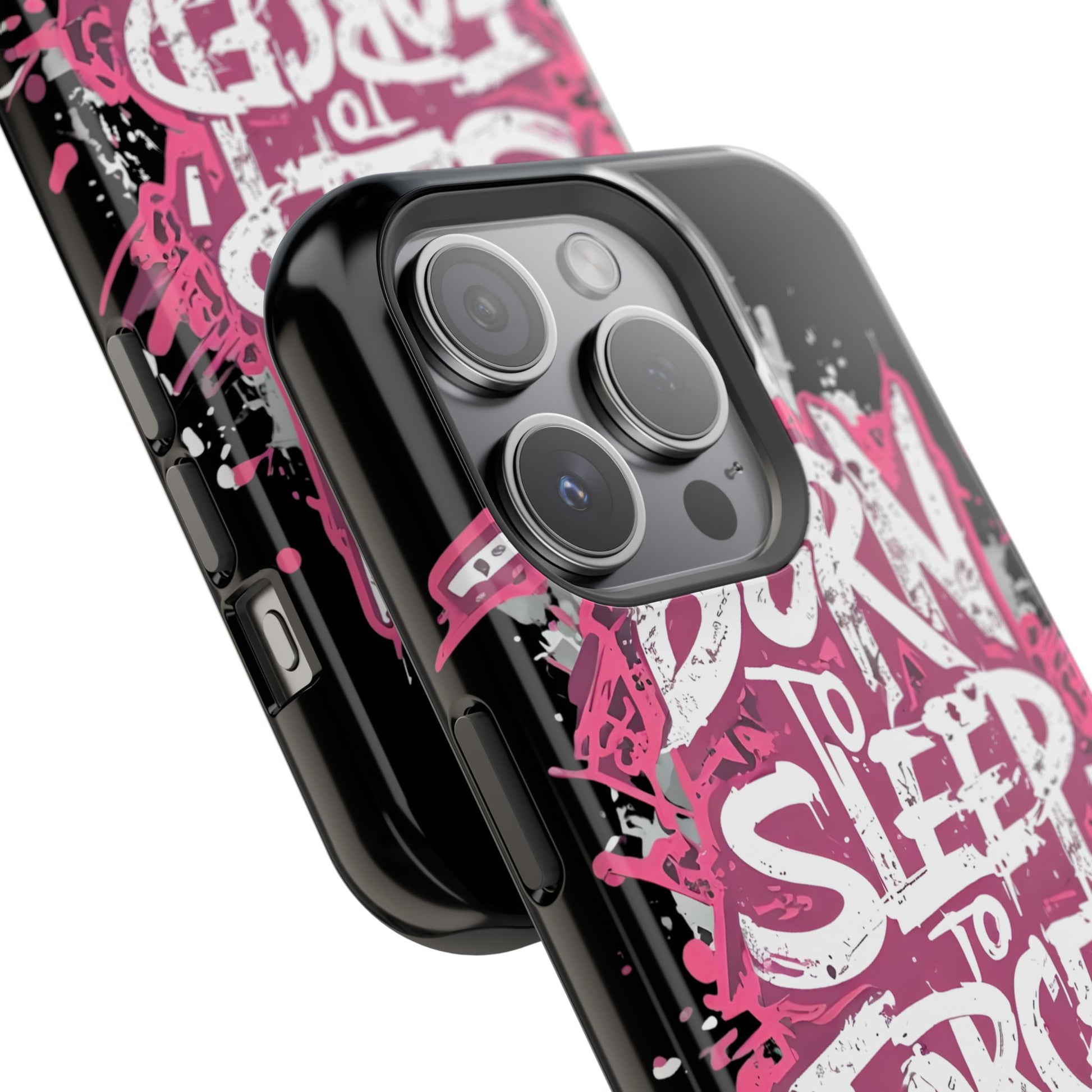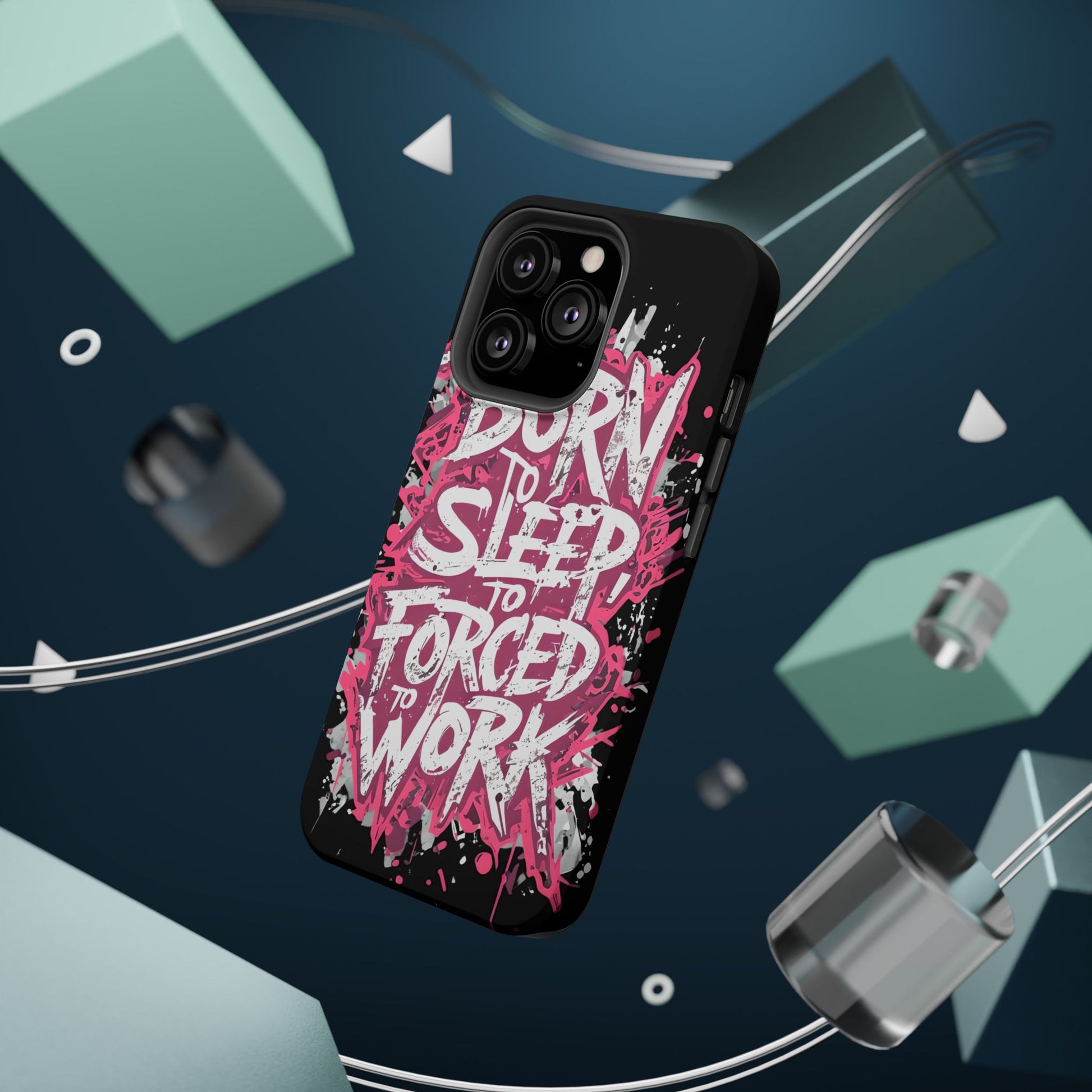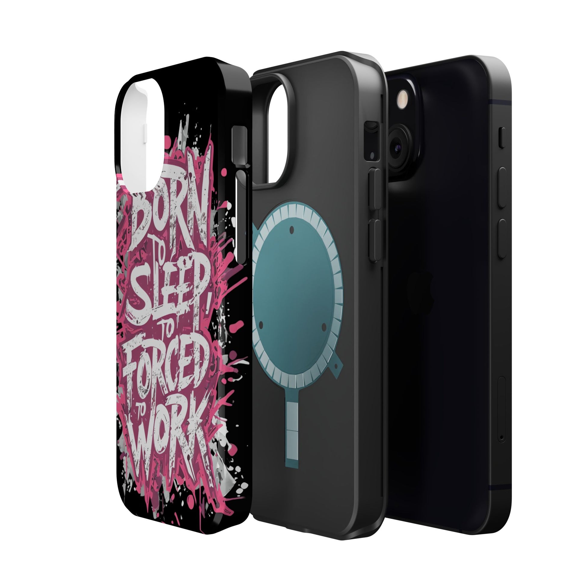 This protective phone case brings bold attitude to your daily carry. A gritty graffiti-style design — hot pink splatters and jagged white lettering that reads “BORN TO SLEEP TO FORCED TO WORK” — turns your device into a statement piece. The rigid polycarbonate shell and cushioned TPU liner work together to resist scratches and light impacts while maintaining a slim profile. Interior magnets add MagSafe compatibility so the case plays nicely with chargers and accessories. Choose glossy for eye-catching shine or matte for a stealthy, velvety finish. It’s made for adults who want their phone protection to reflect a wry, rebellious sense of humor and city-street energy.
