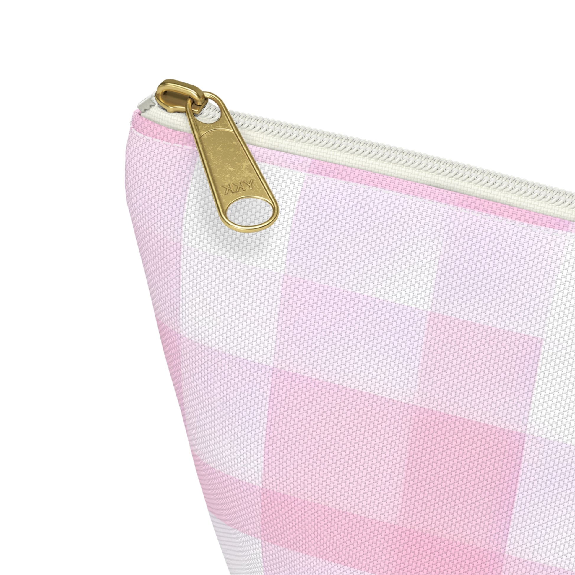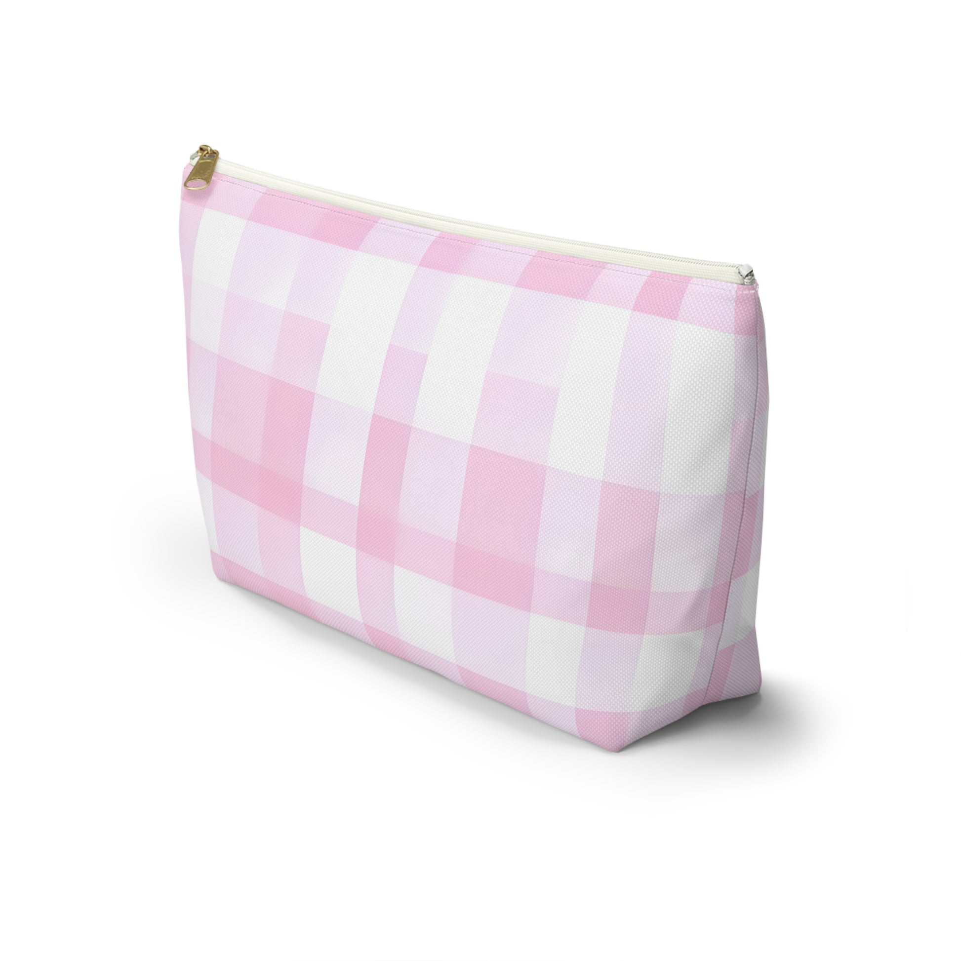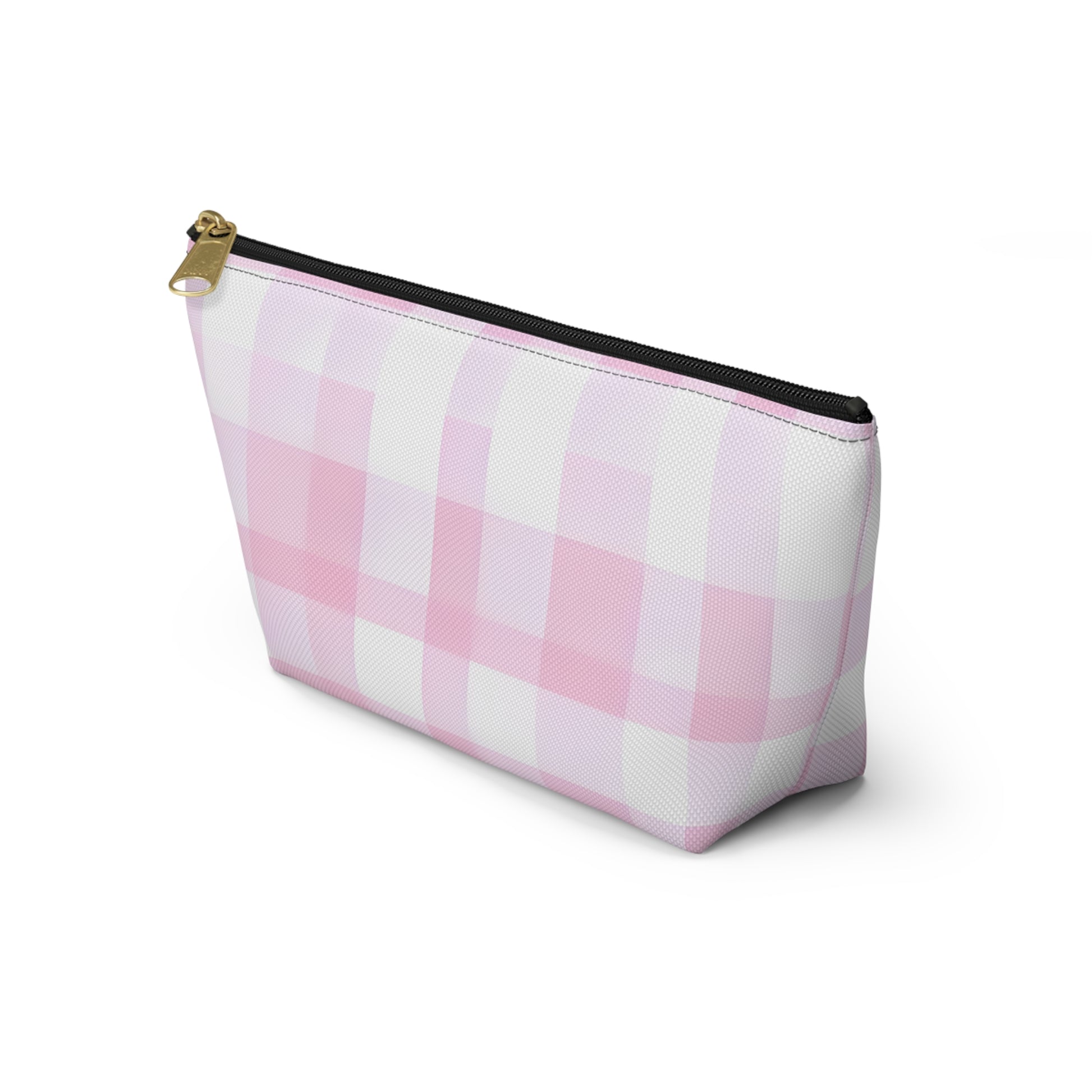 Soft, sunlit mornings and the quiet satisfaction of order — this accessory pouch brings that calm into everyday life. The gentle pink gingham print reads like a favorite apron or a picnic blanket, cheerful without shouting. Its T-bottom gives it a roomy, stable base so brushes, chargers, or cosmetics sit upright and easy to find. The smooth zipper with a gold puller slides open to reveal a laminate-lined interior that keeps spills contained and items tidy. Lightweight and low-maintenance, it slips into a tote or sits on a vanity, bringing a touch of pastel charm to morning routines and on-the-go moments.