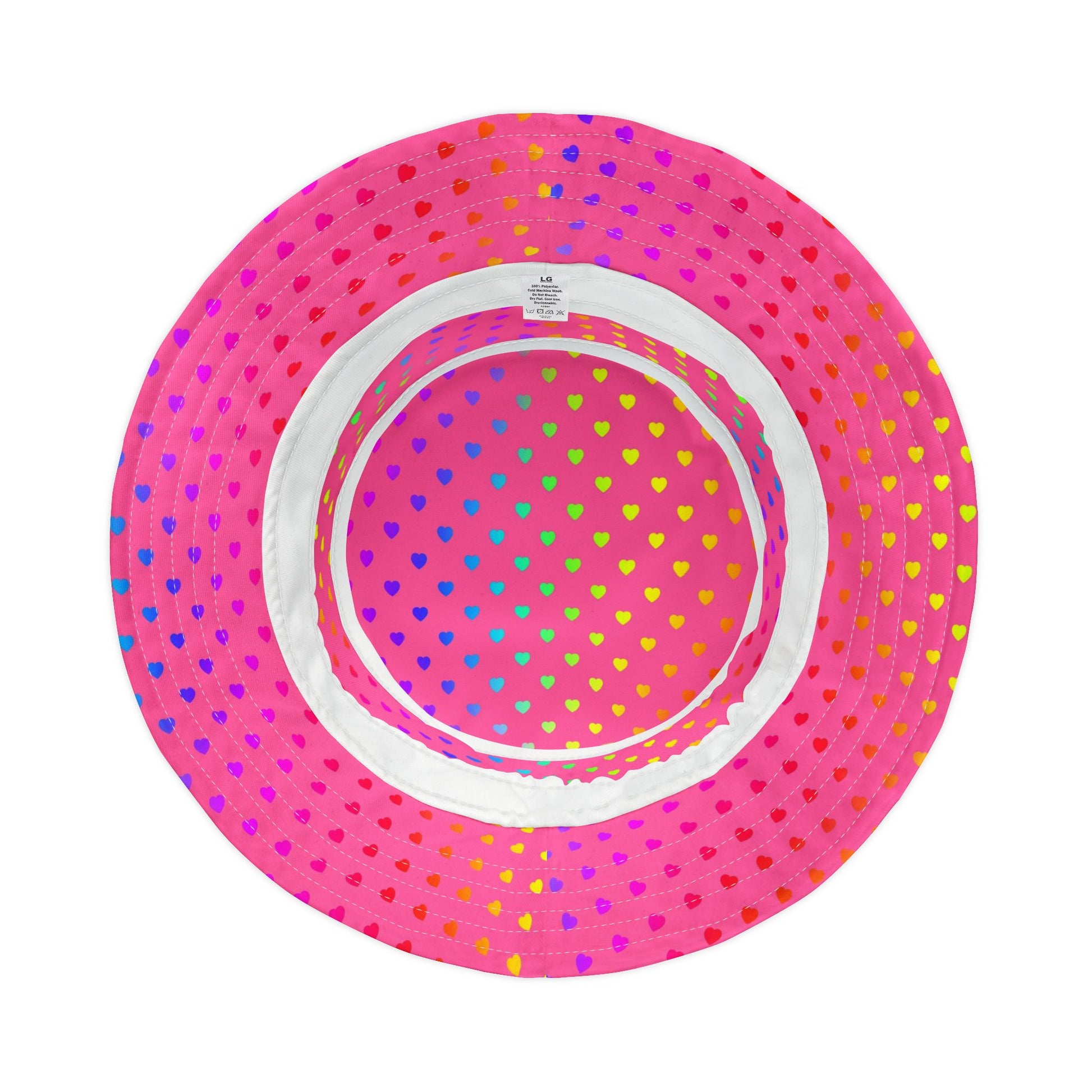 A playful, sun-ready bucket hat that brings bright energy to every outing. Lightweight polyester holds a vibrant pink base sprinkled with tiny rainbow hearts — cheerful without being loud. The structured brim offers shade for long festival days or breezy beach walks. Choose one of two stitching colors to subtly customize the trim, and pick from three sizes for a comfortable fit. Made in the USA with a sewn-in label, this hat is an easy, joyful accessory to slip on when you want color and confidence in equal measure.