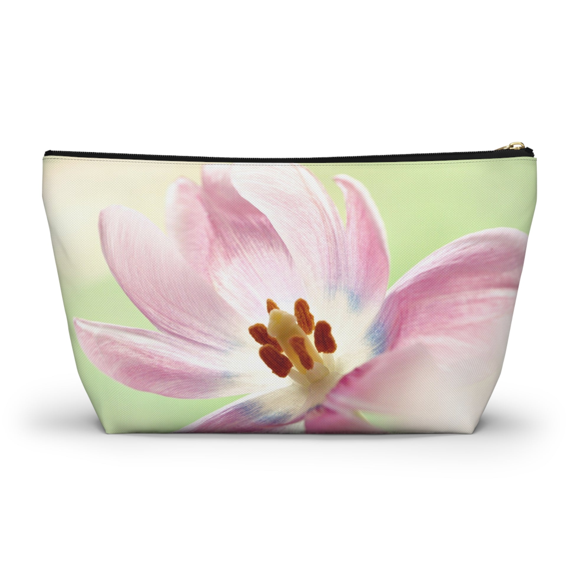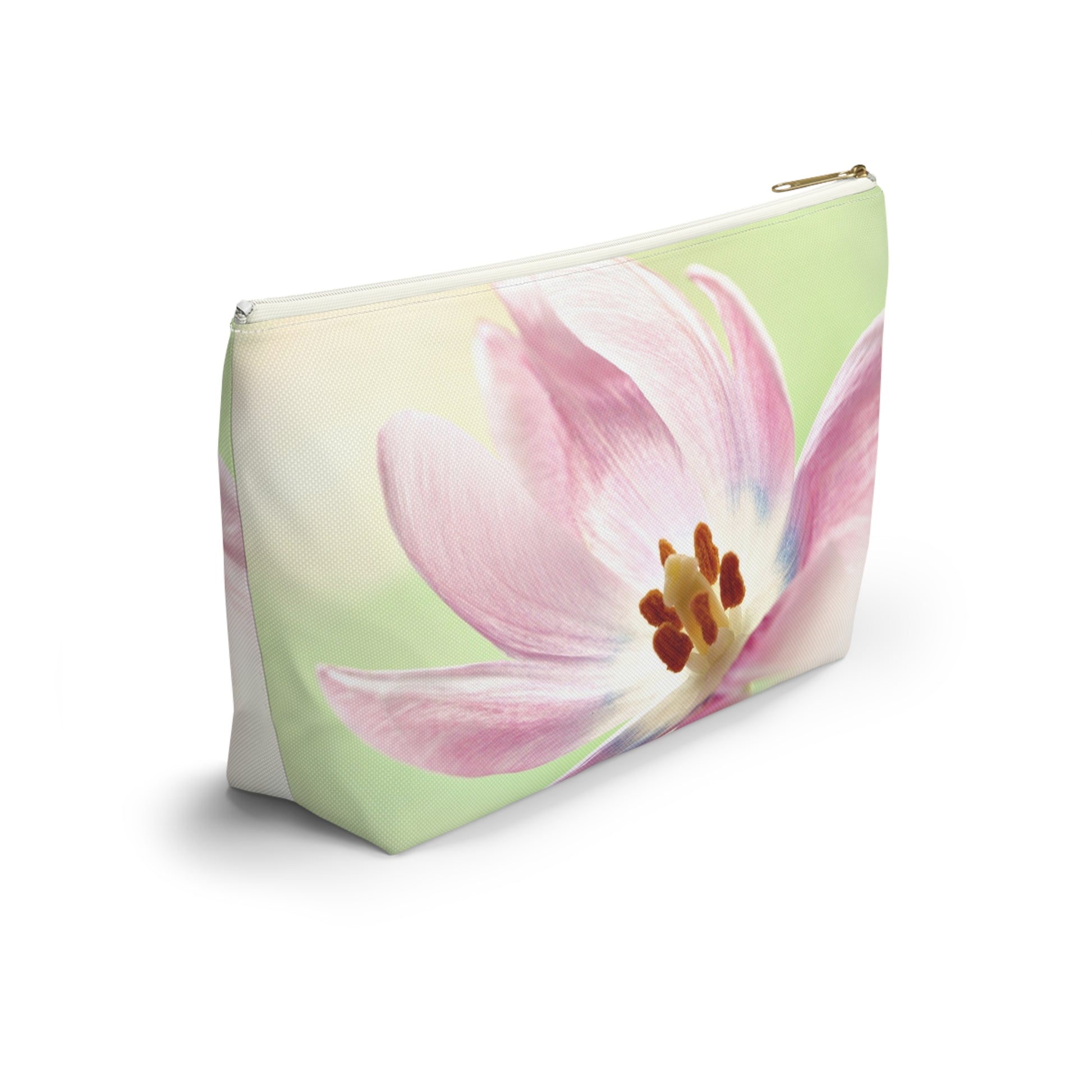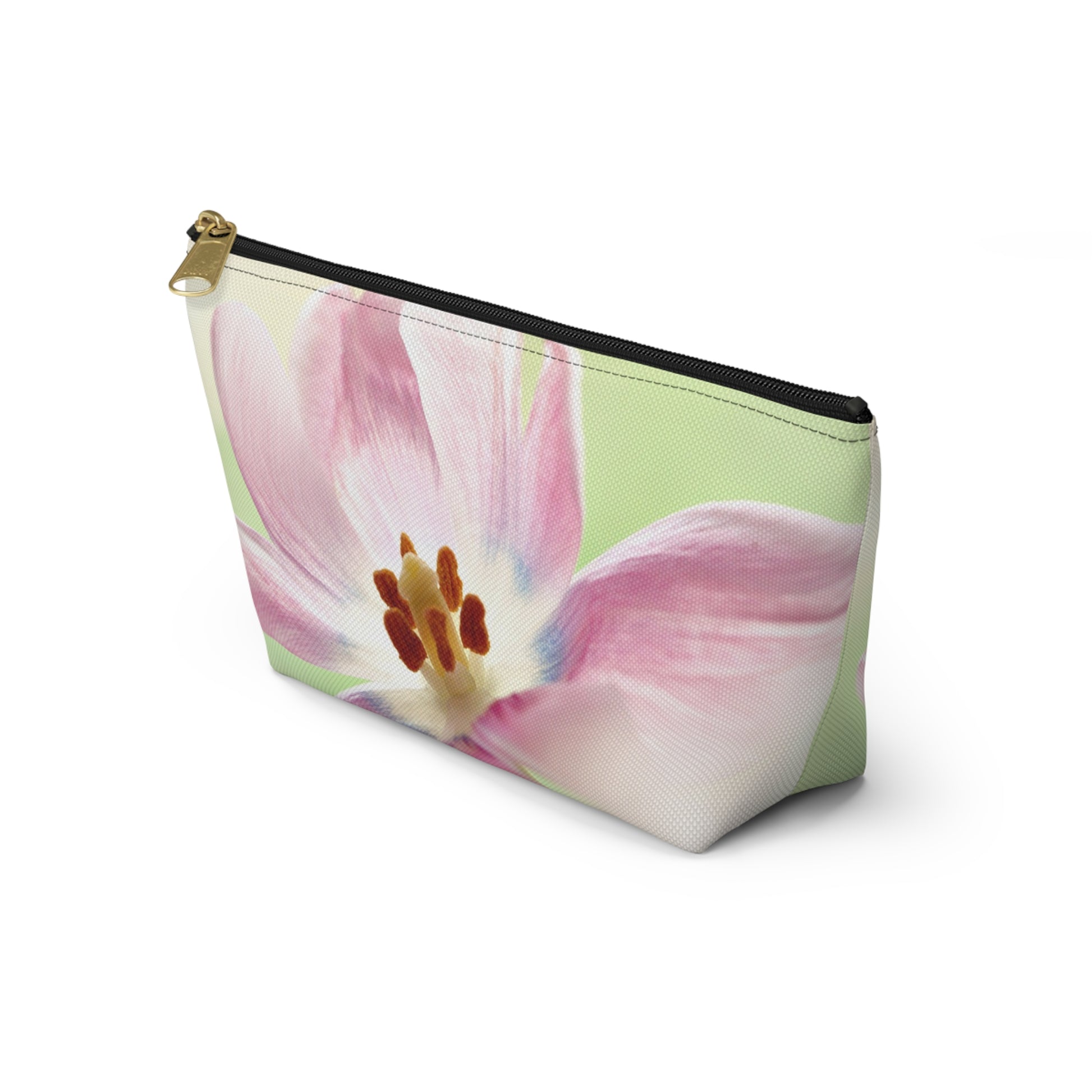 A soft, floral accessory pouch that carries a gentle sense of spring wherever you go. The watercolor-like pink bloom floats against a muted green background, turning a simple pouch into a small canvas of calm. Lightweight yet structured, it slips into a tote or sits on a vanity holding makeup, chargers, or everyday essentials. The gold zipper pull adds a subtle, elegant gleam while the durable polyester keeps the print vivid and crease-free. Use it to corral items while you travel, refresh your desk, or tuck into a handbag for quick access to the things you reach for most.