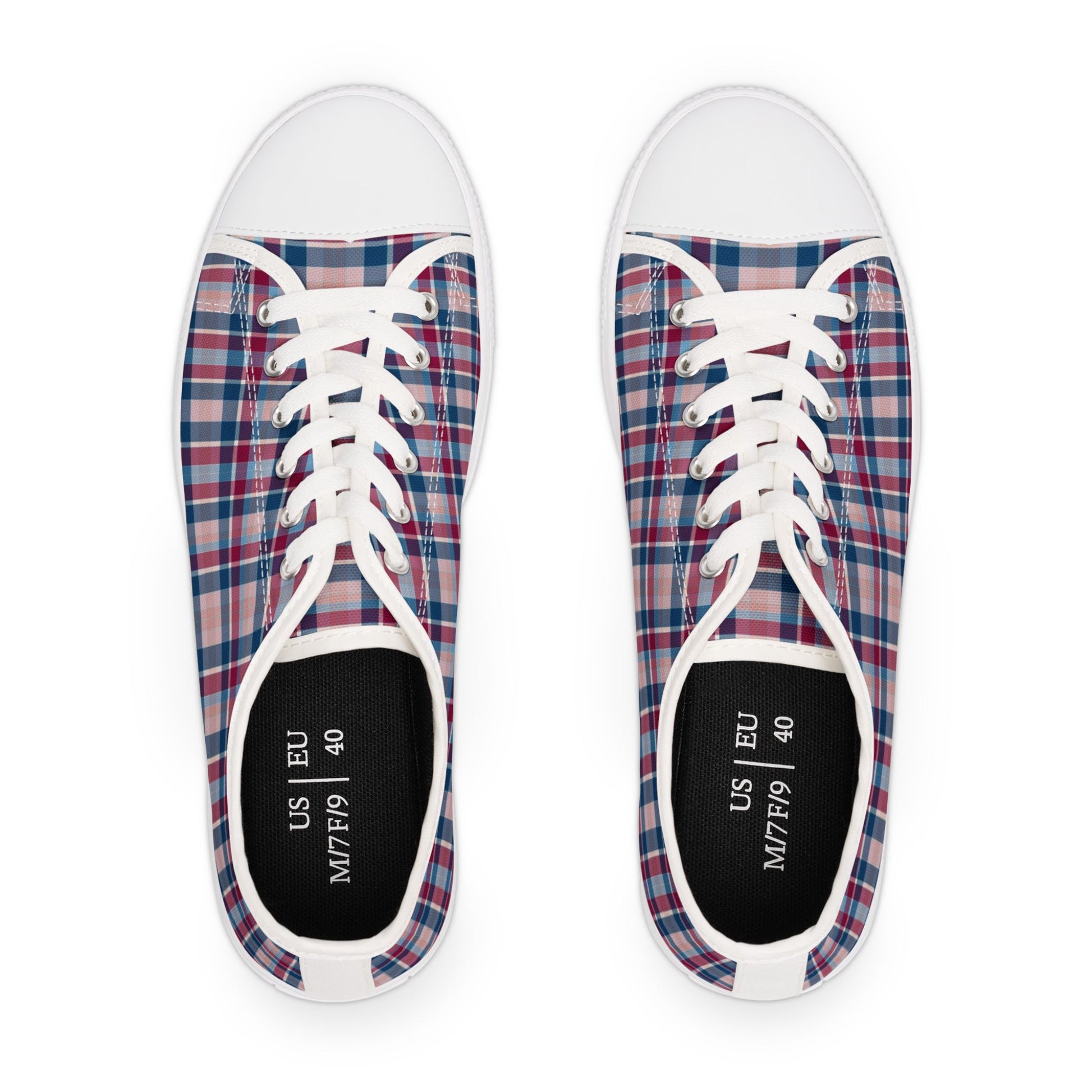 These low-top canvas sneakers bring playful plaid to everyday steps. Lightweight EVA soles and memory foam insoles keep you moving with cushioning that responds to your stride. The breathable polyester canvas and pleather toe give a balanced mix of softness and durability, while silver metal eyelets and PU leather accents add a clean, finished look. The full wraparound print keeps the pattern seamless from tongue to heel, and the durable rubber outsole stands up to city sidewalks and weekend wanderings. They feel like a familiar favorite the moment you slip them on.