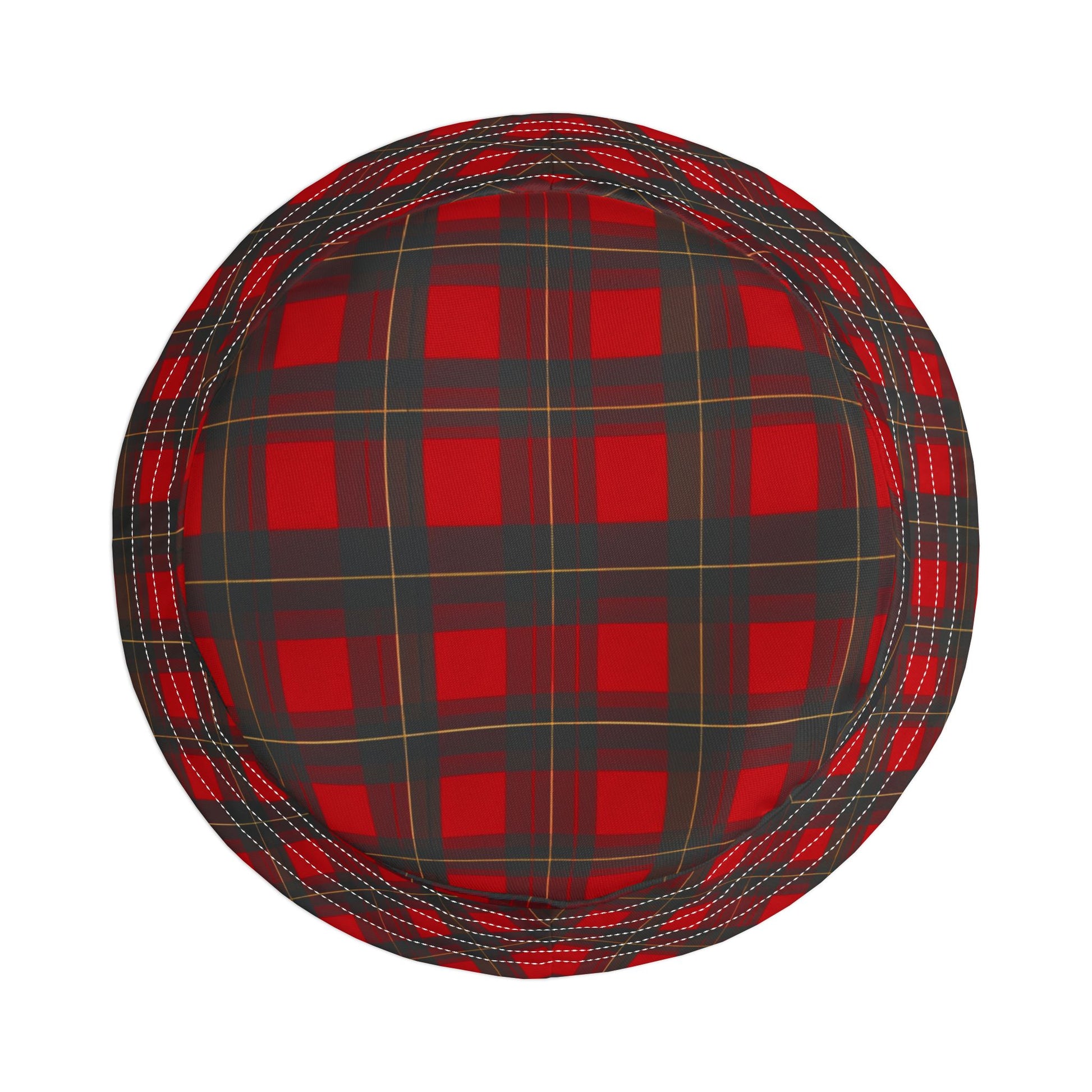 This red and black plaid bucket hat brings a cozy, lived-in vibe to sunny days and late-night festivals alike. Lightweight polyester holds vivid color and soft structure, while decorative top and brim stitching adds a handcrafted touch. Three size options help you get the right fit, and the sewn-in label and two stitching-color choices let you make it feel a little more yours. Wear it on a drives down country roads, layered over a beanie at a fall bonfire, or as a steady companion during loud, crowded shows — it’s the kind of hat that settles into your rotation and starts showing stories at the edges.