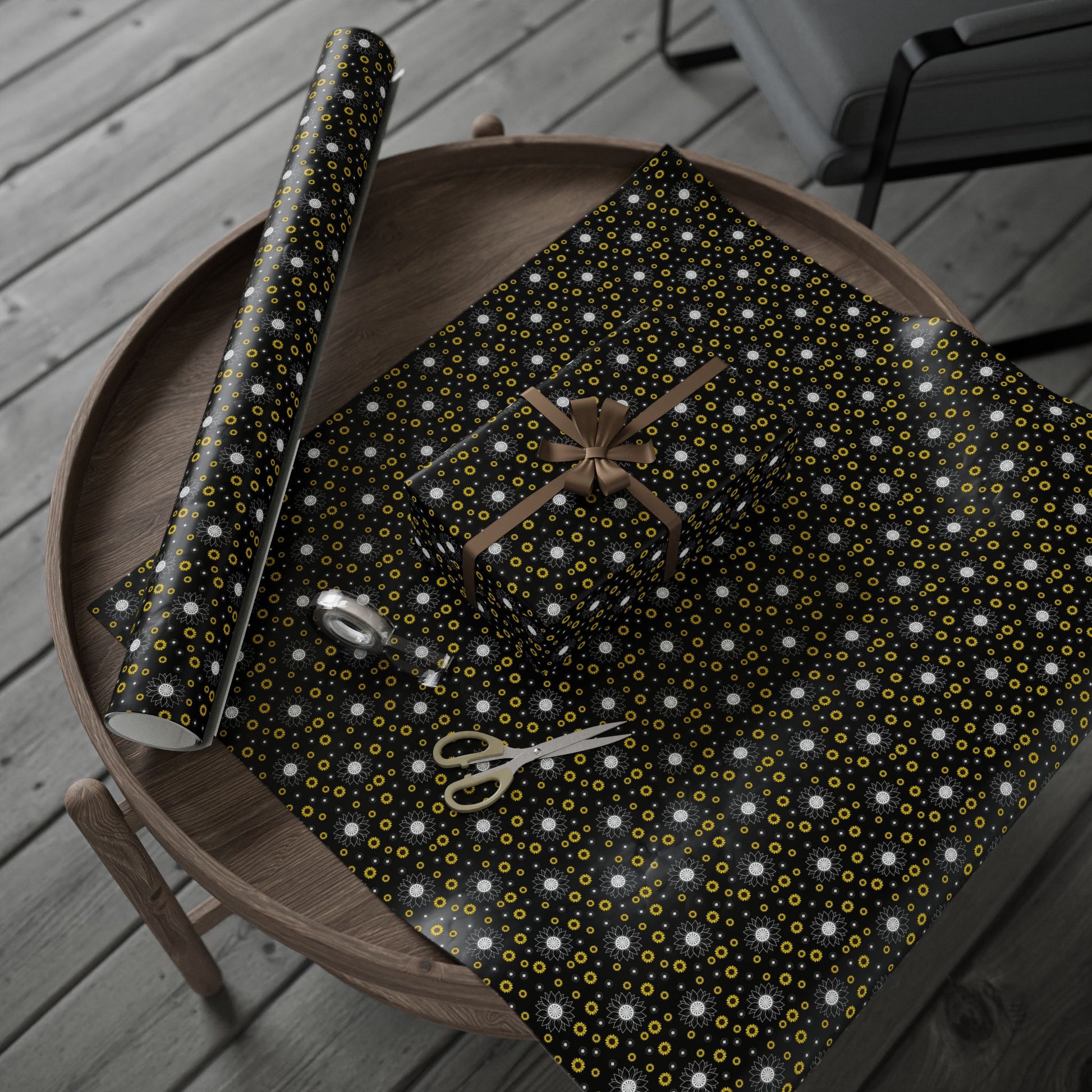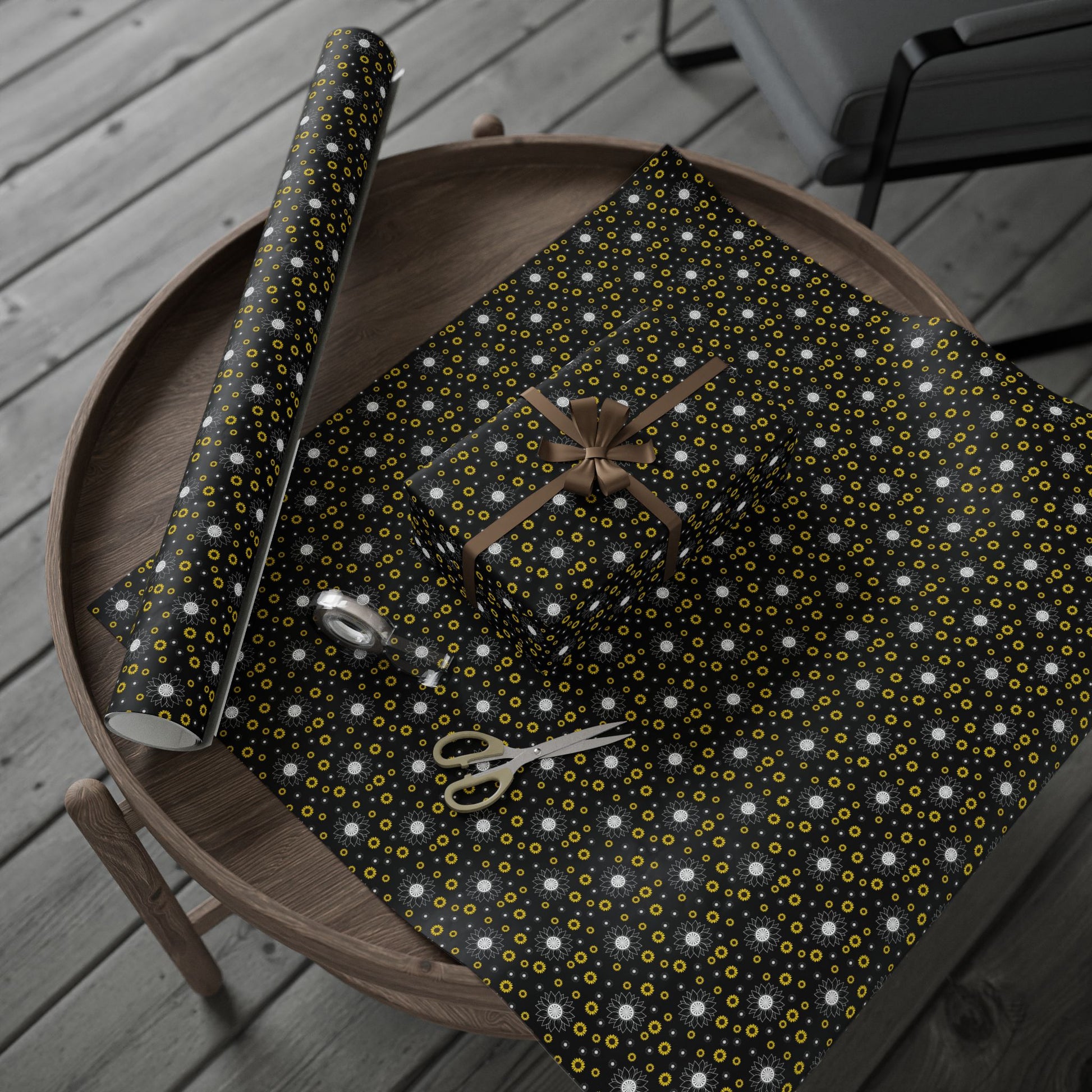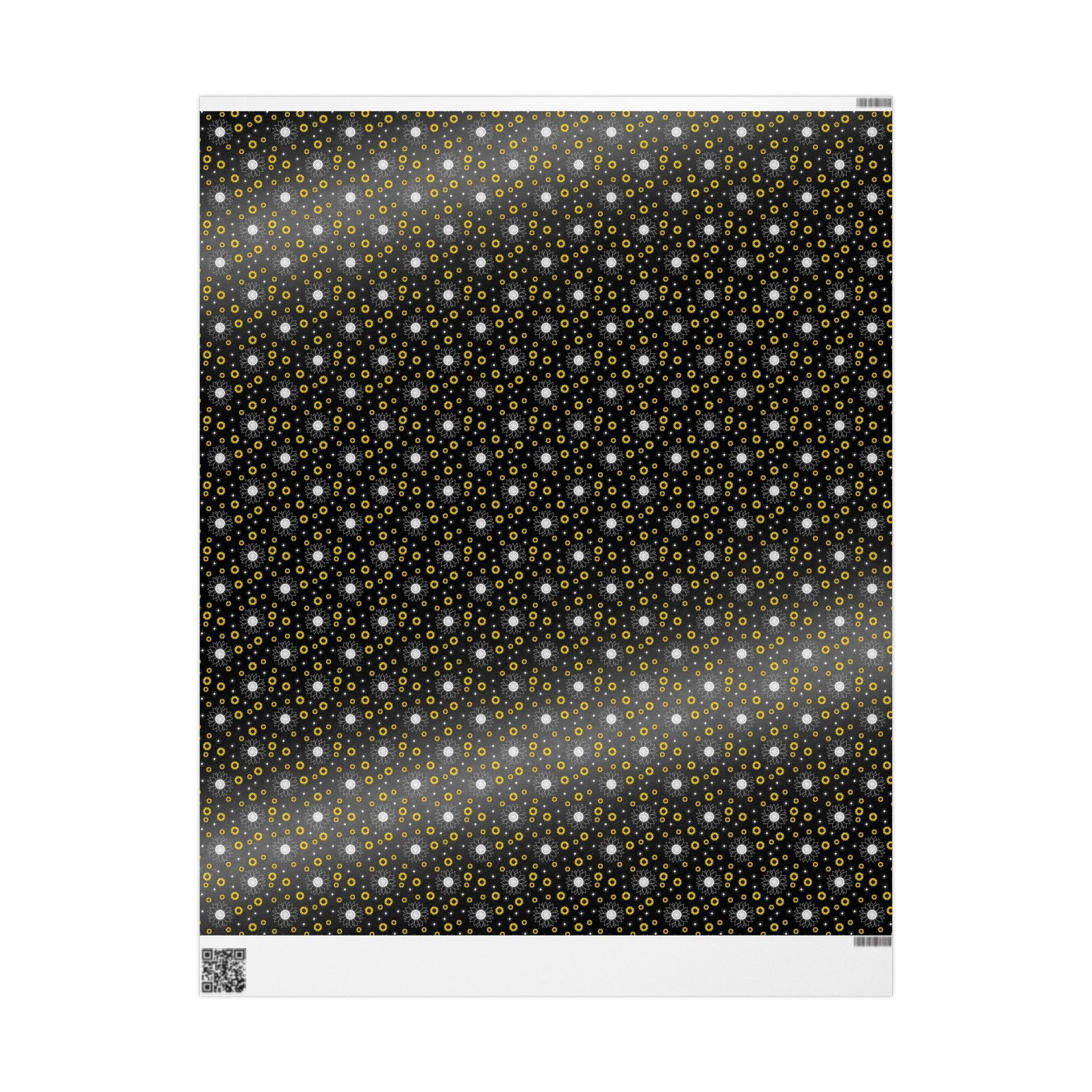 A roll of artful wrapping paper that turns ordinary gifts into memorable moments. The deep black background makes crisp white and sunflower-yellow floral motifs pop, creating a modern yet warm look. Lightweight and smooth, the paper wraps neatly around parcels and holds creases cleanly — great for layering with ribbon or kraft accents. Choose between a glossy sheen that brightens colors or a soft matte finish for a refined, tactile feel. Available in three generous lengths so you can cover small boxes or long parcels without seams. A subtle white trim with a small barcode and QR code appears at the roll edges as part of production.