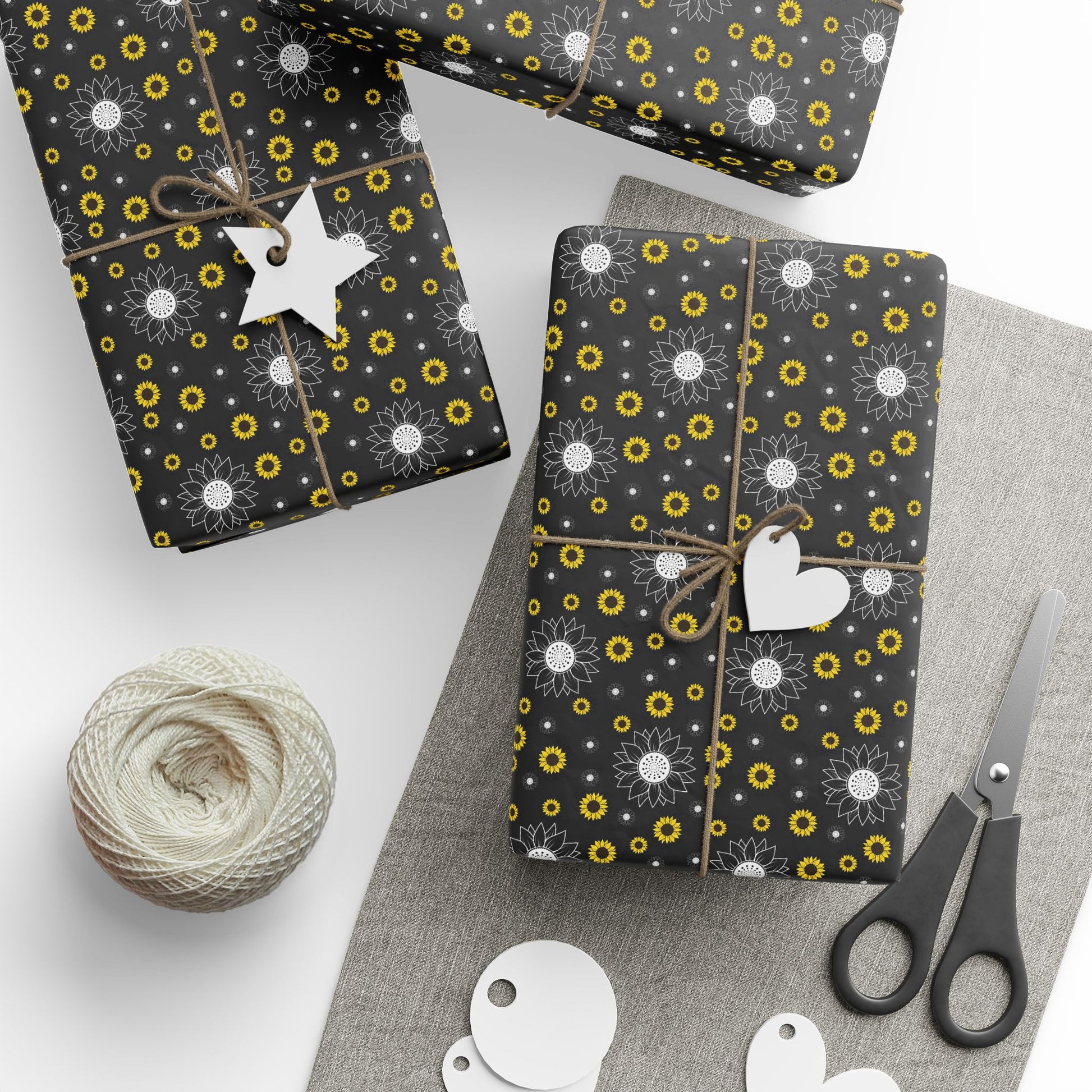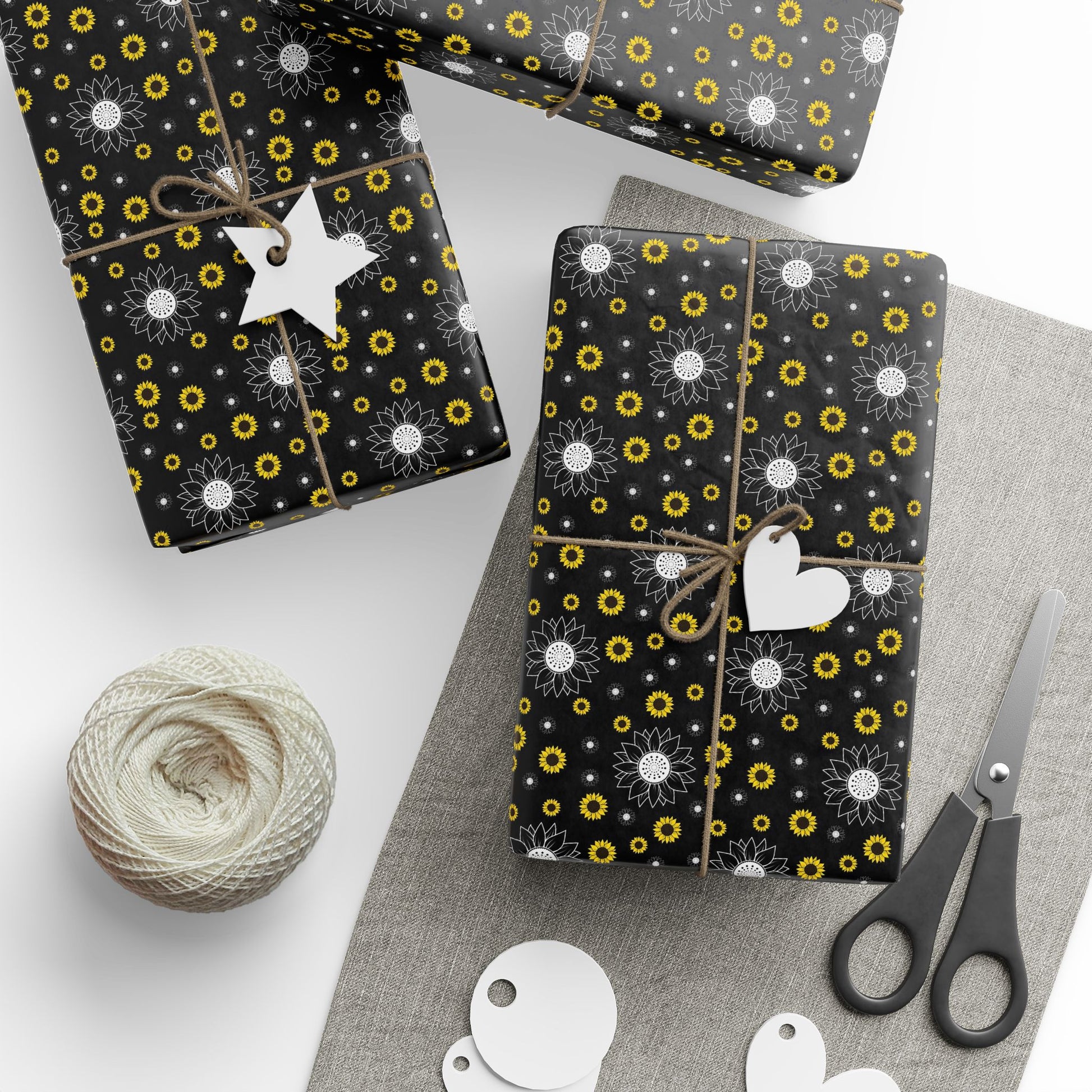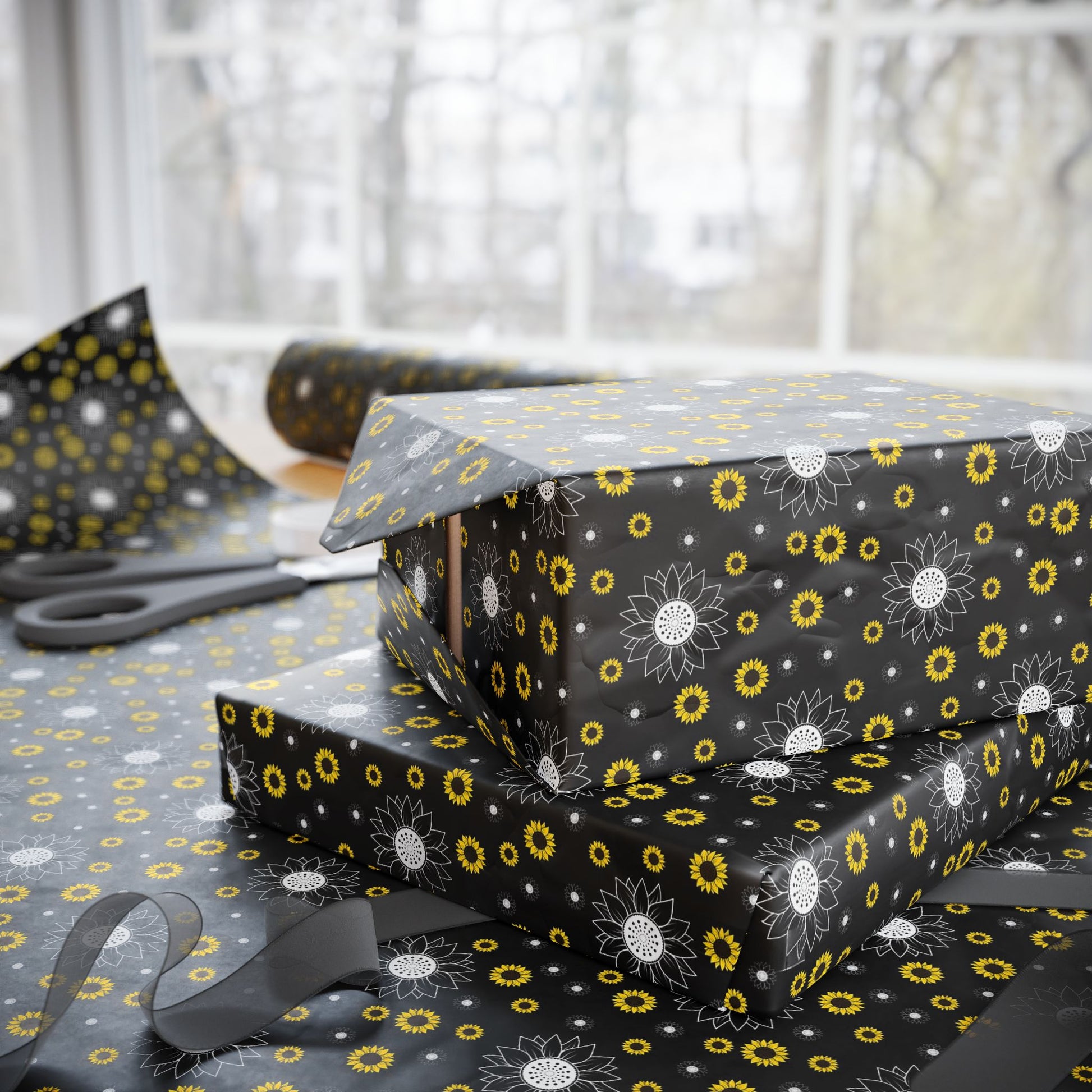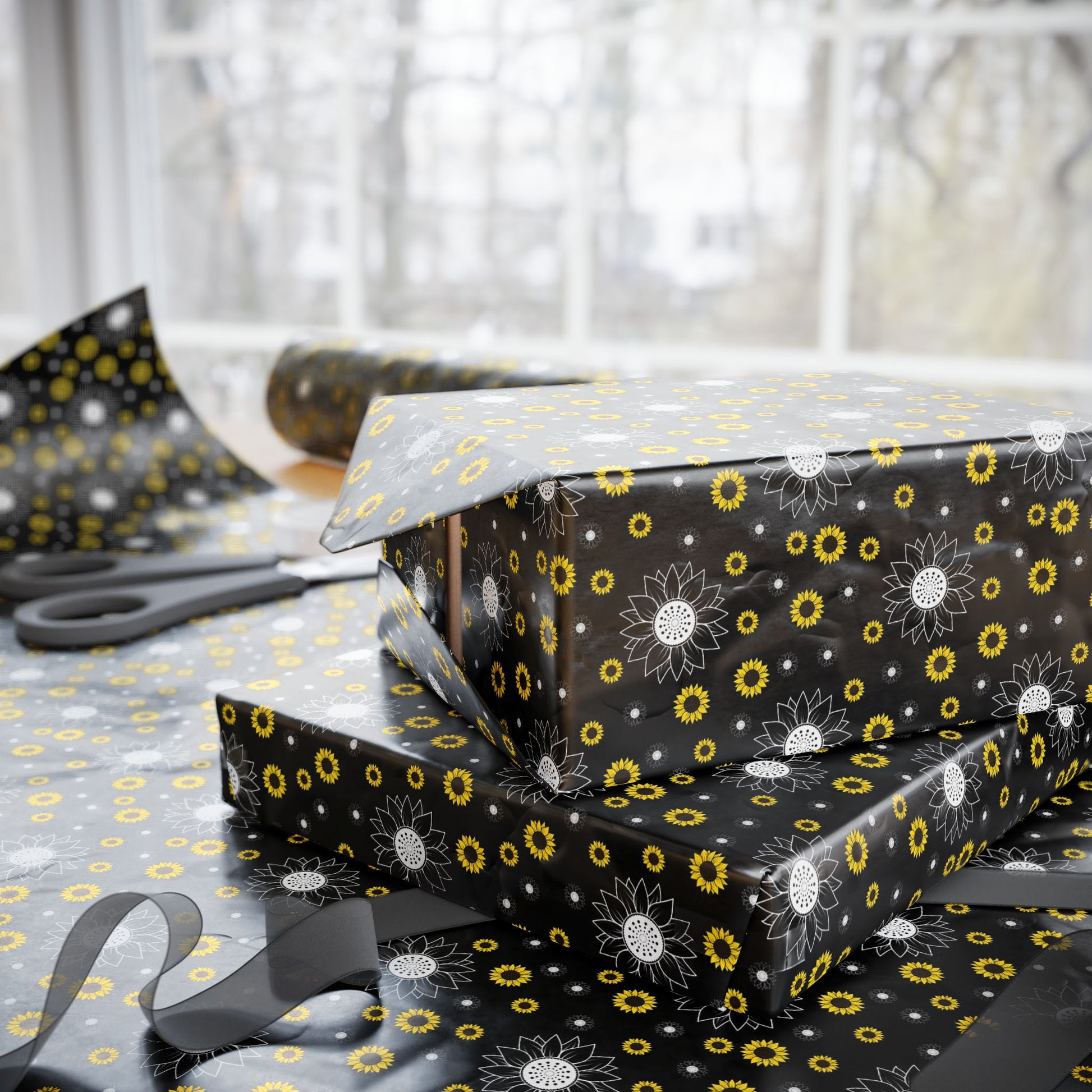 A roll of artful wrapping paper that turns ordinary gifts into memorable moments. The deep black background makes crisp white and sunflower-yellow floral motifs pop, creating a modern yet warm look. Lightweight and smooth, the paper wraps neatly around parcels and holds creases cleanly — great for layering with ribbon or kraft accents. Choose between a glossy sheen that brightens colors or a soft matte finish for a refined, tactile feel. Available in three generous lengths so you can cover small boxes or long parcels without seams. A subtle white trim with a small barcode and QR code appears at the roll edges as part of production.