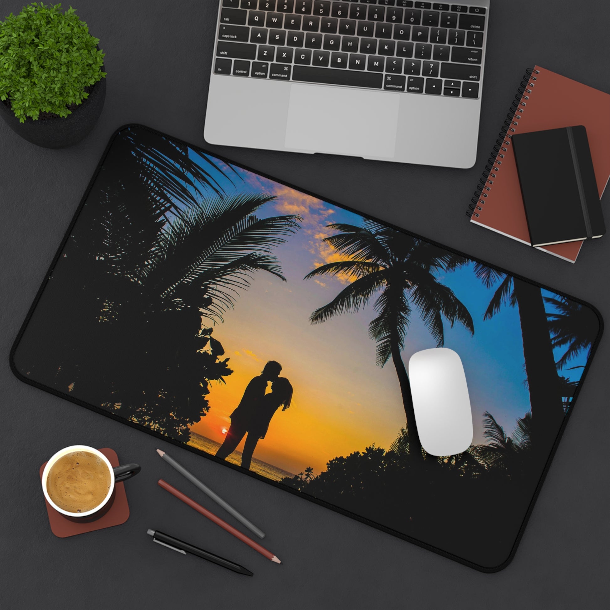 A tranquil sunset captured on a soft neoprene desk mat — warm golds melt into deep blues while silhouetted palms frame a couple sharing a quiet moment. Lay it across your workspace to bring a slice of shoreline calm to your desk. The textured, anti-slip backing keeps your keyboard and mouse steady during long creative sessions, and the stitched edges hold up to daily use. Choose from three sizes to anchor a laptop nook, a full desktop setup, or a crafting station. This mat brightens the room without shouting, and turns ordinary work into a brief seaside pause.