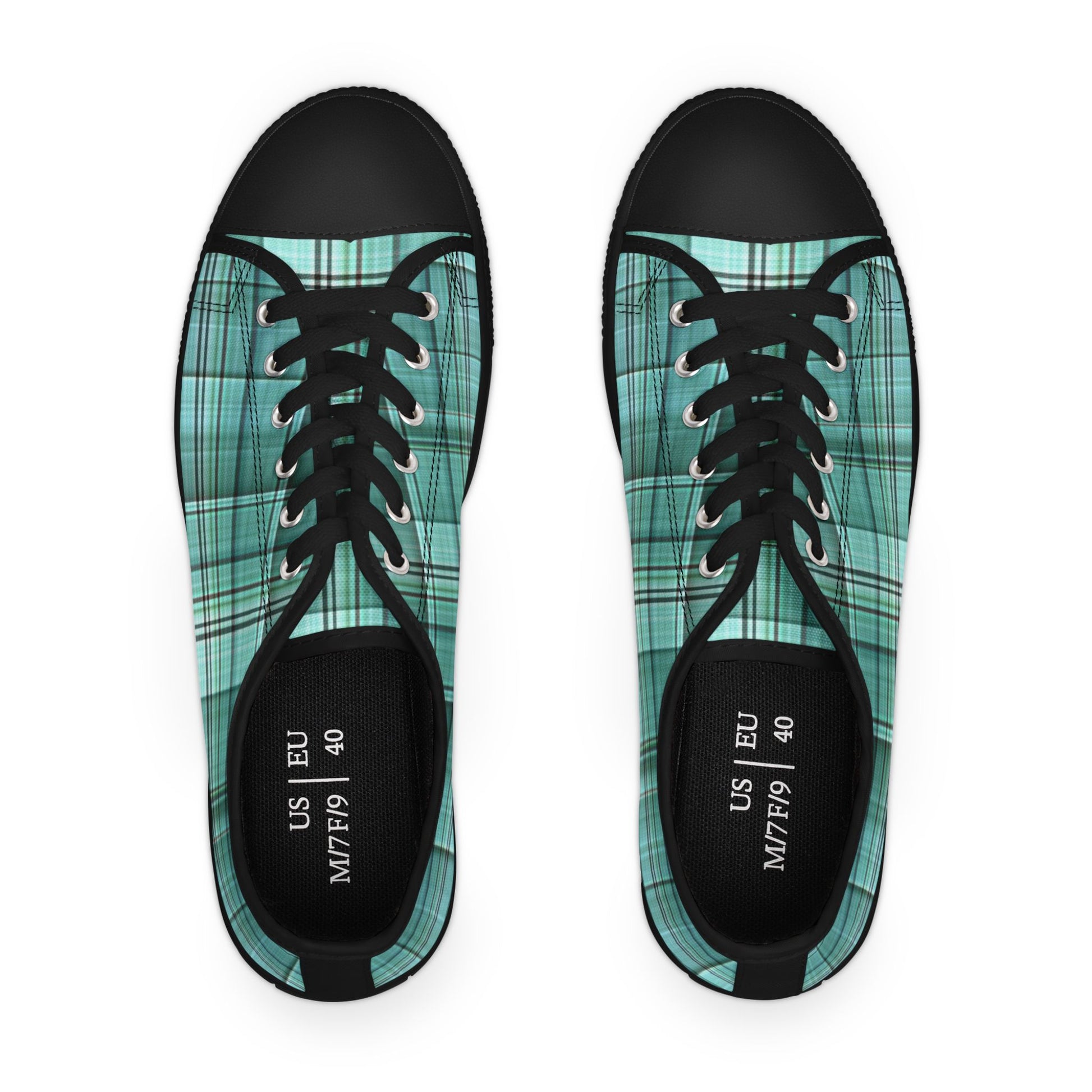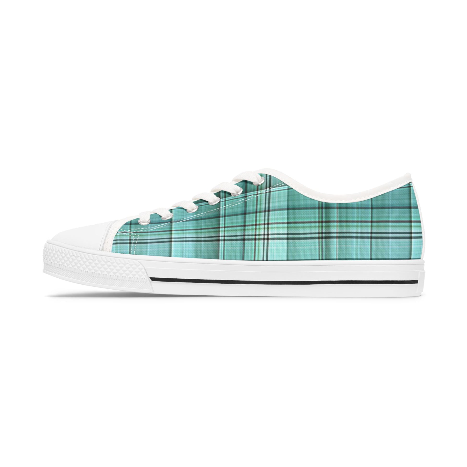 These low-top canvas sneakers bring a soft, lived-in vibe to everyday steps. The teal plaid wraparound print feels like a fresh breeze—familiar and slightly nostalgic—while the pleather toe and durable rubber outsole stand up to city streets and weekend wanderings. Inside, hi-poly memory foam and EVA shock-absorbing layers cushion every stride so running errands or wandering a market stays comfortable. Metal eyelets and tidy PU leather trim add subtle polish. Wear them with cuffed jeans, a casual dress, or your favorite oversized sweater to add a splash of gentle color to routine days and low-key celebrations.