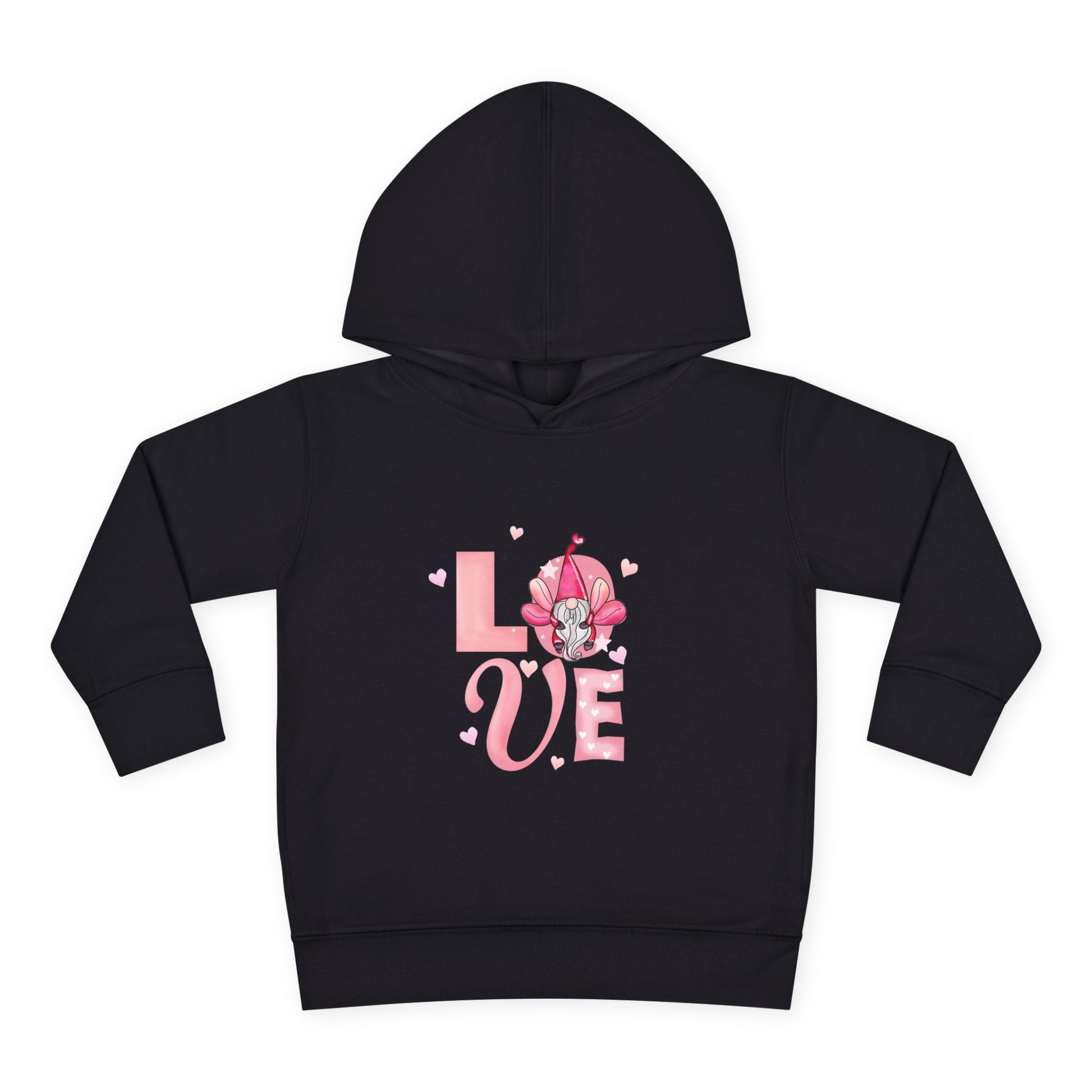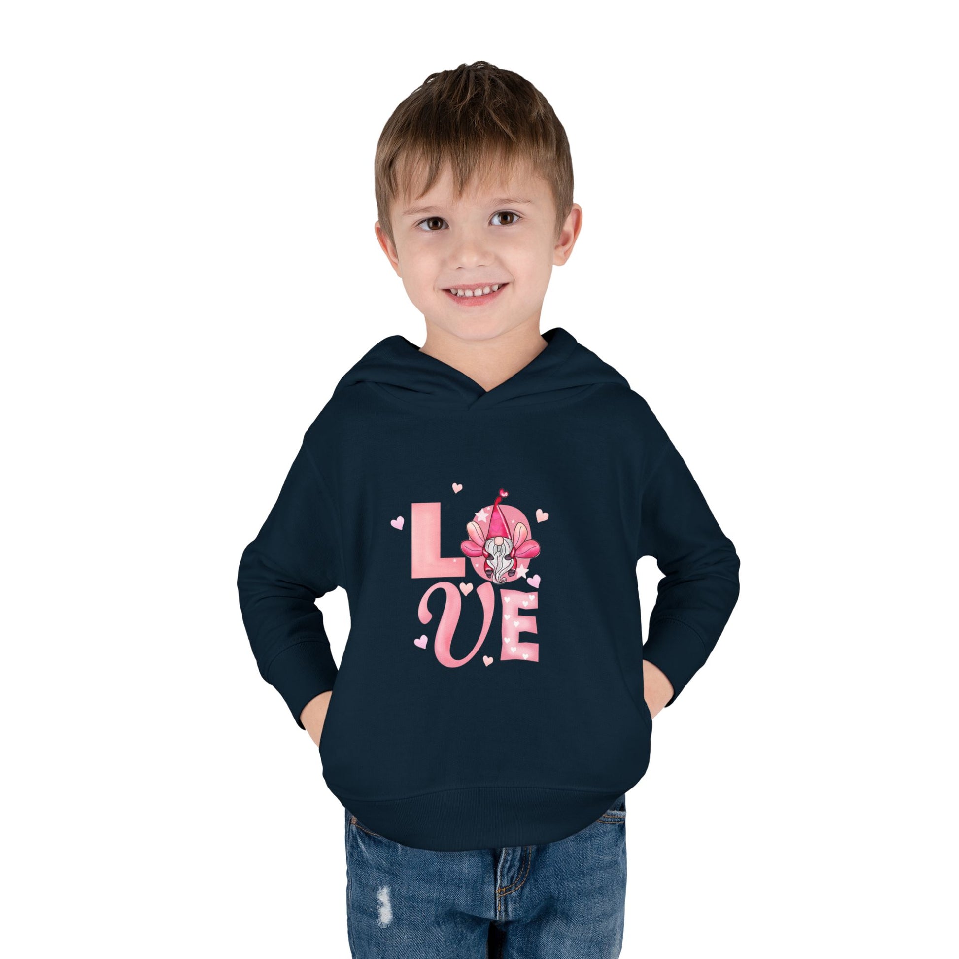 A cozy toddler hoodie designed for little ones who love soft comfort and playful charm. The medium-weight fleece feels gentle against delicate skin while the jersey-lined hood and ribbed cuffs keep warmth in during chilly days. Side-seam pockets give tiny hands a place to tuck treasures, and the smooth, durable coverstitching holds shape through active play and washing. A sweet, pink “LOVE” graphic with heart details adds a cheerful, affectionate touch—great for everyday wear, storytime snuggles, or family outings where comfort matters most.