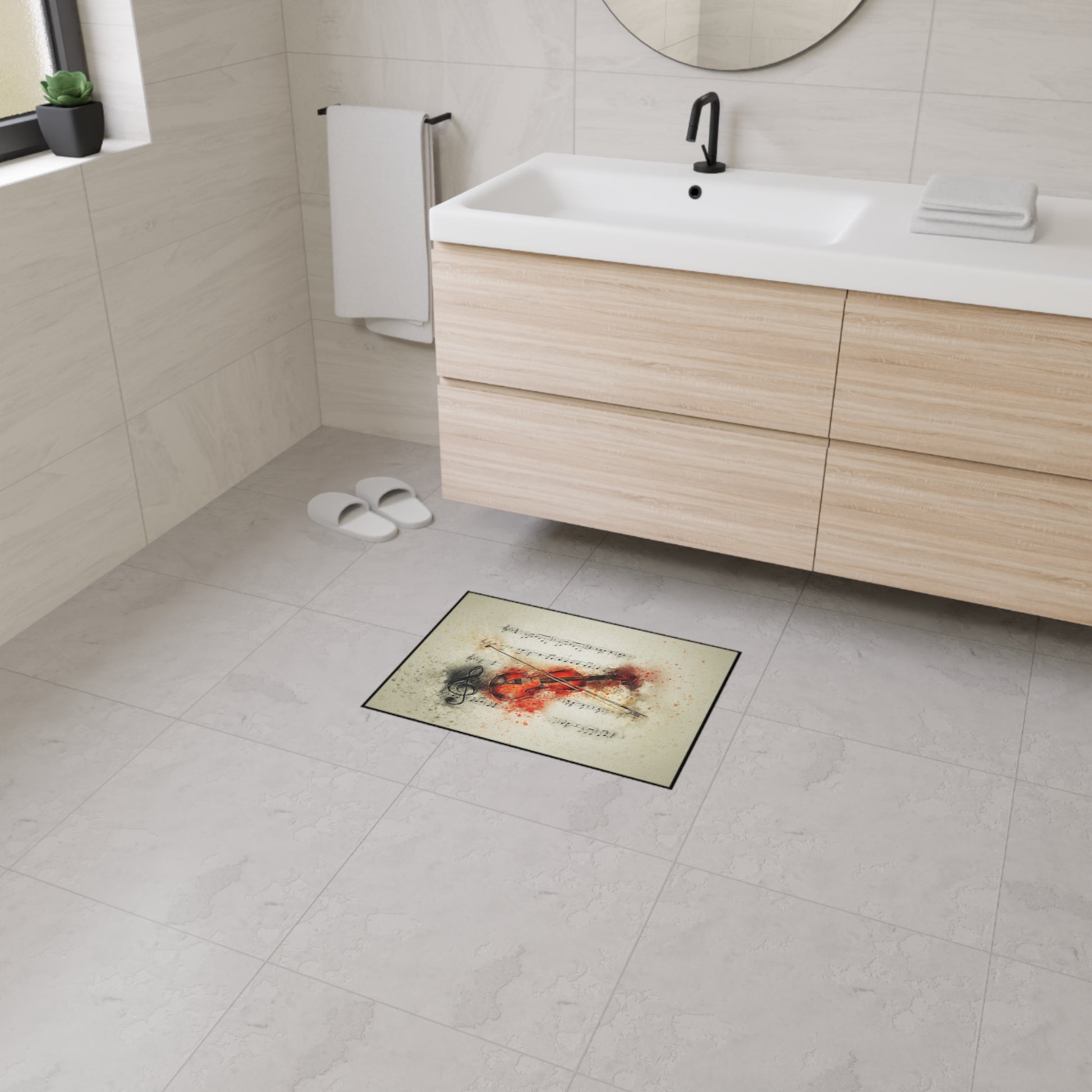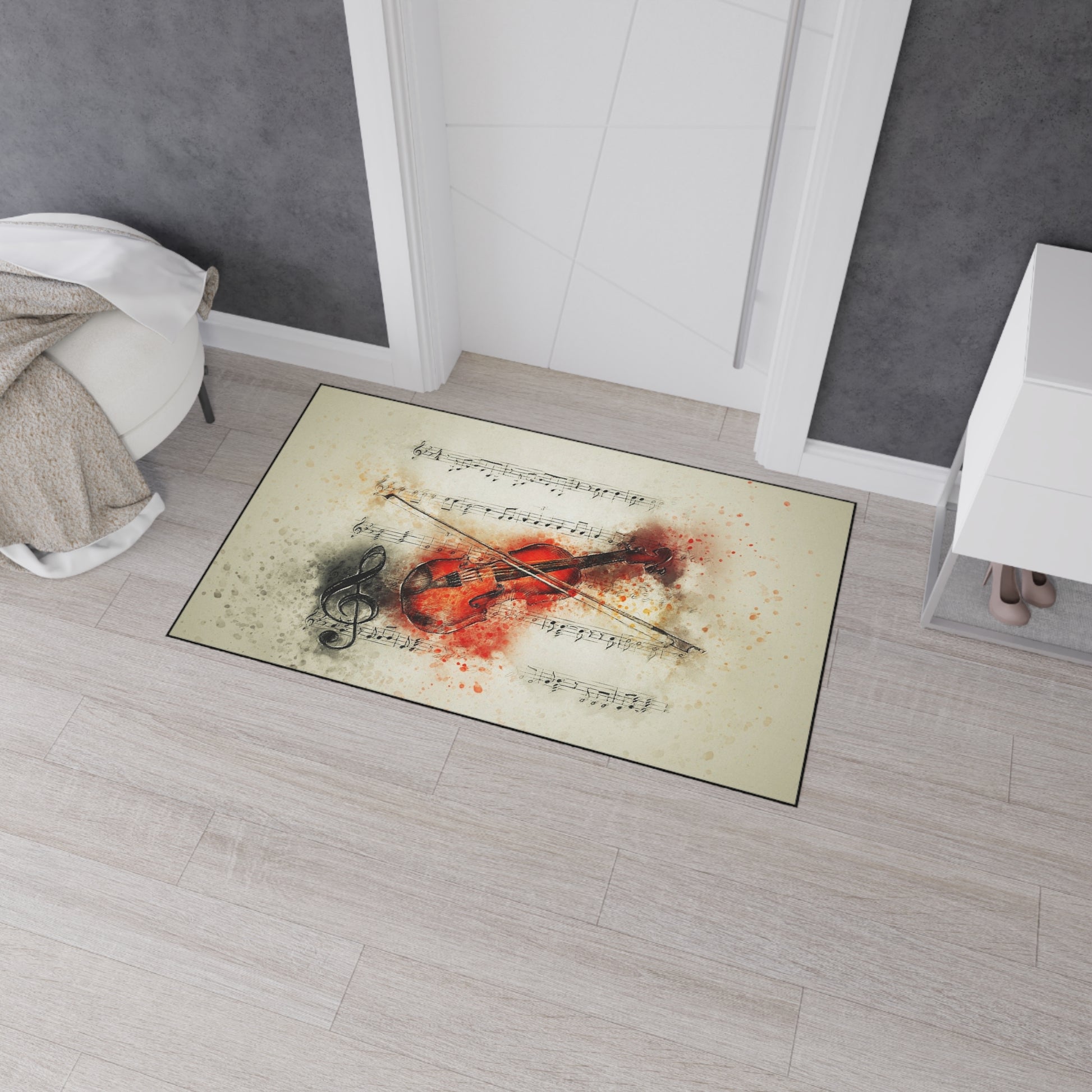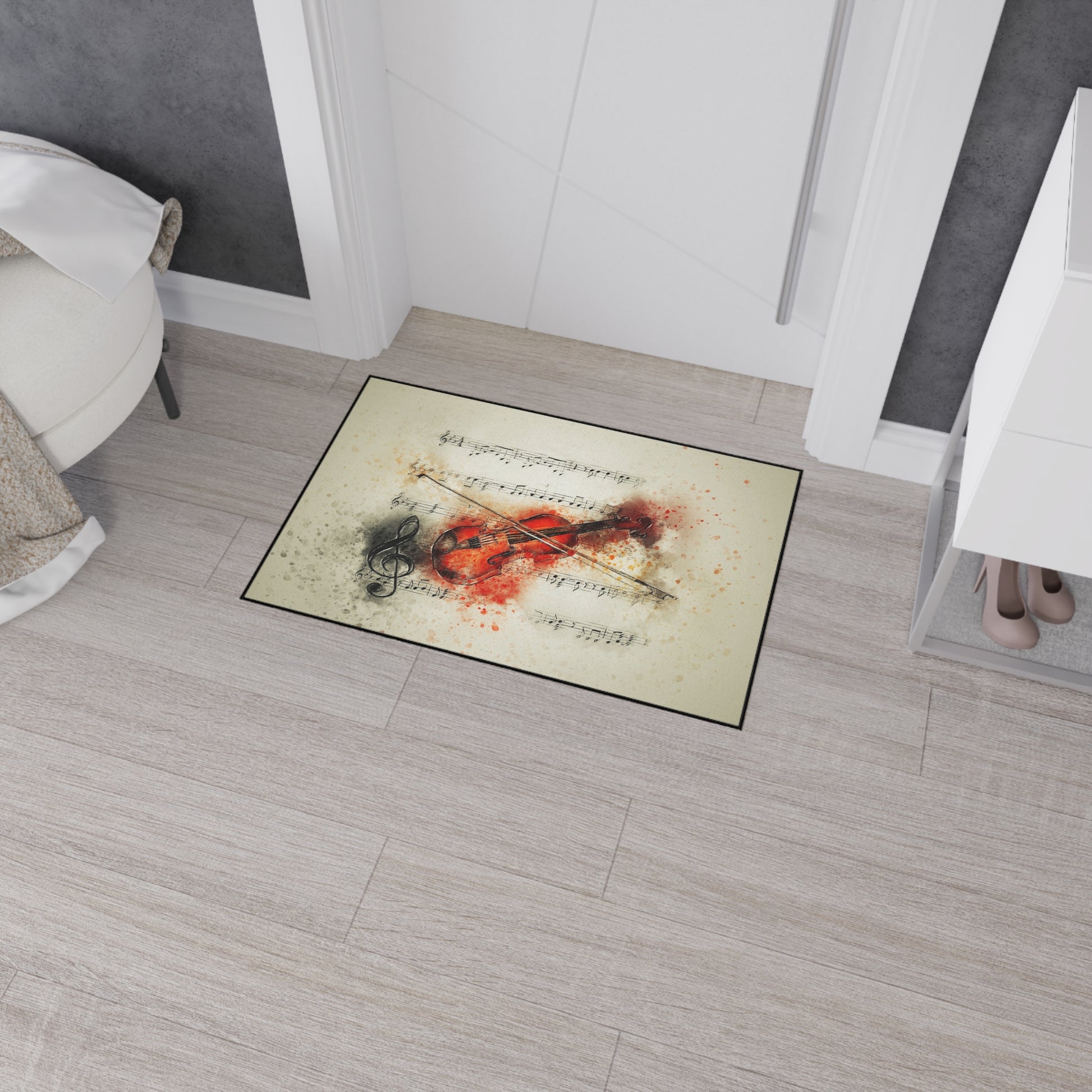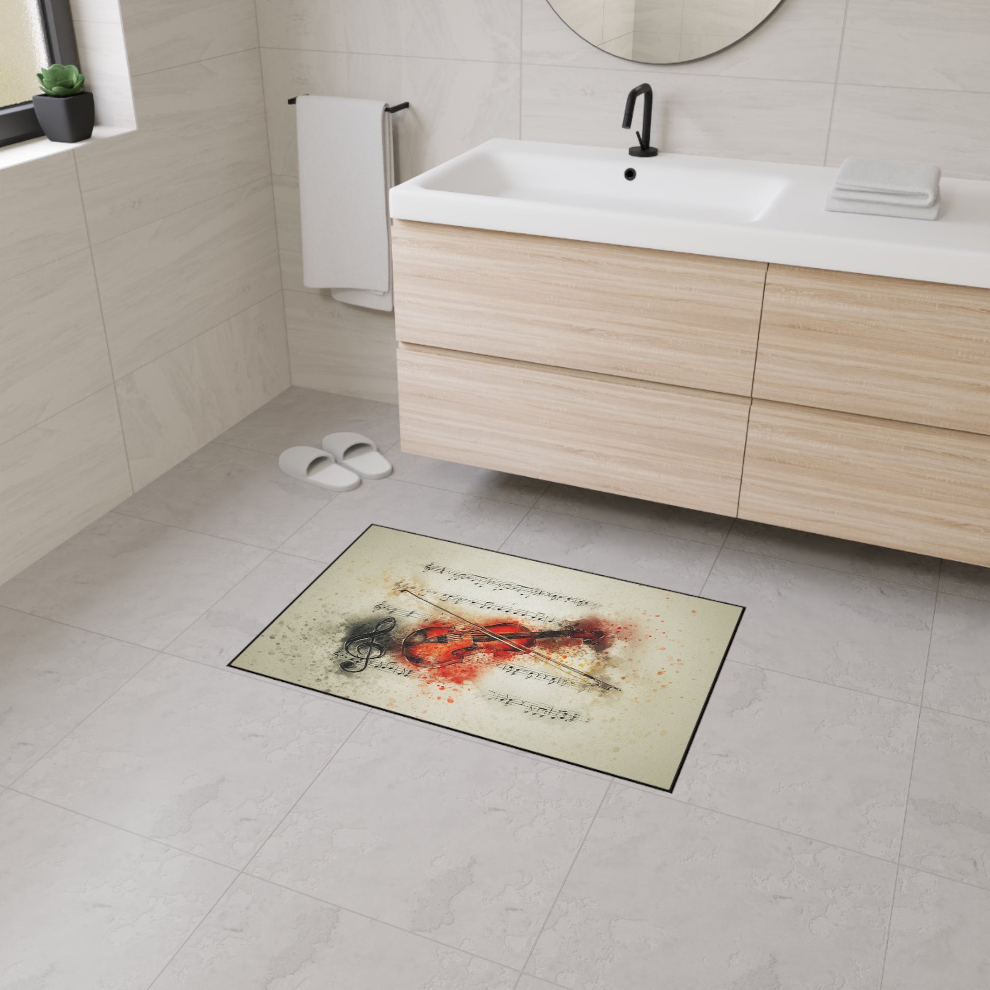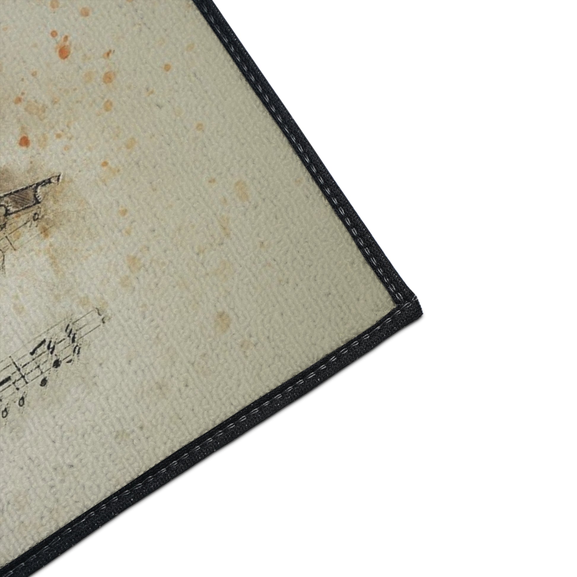 Softly worn paper, a splash of crimson, and the ghost of a bow—this floor mat brings music into the room without saying a word. Place it where melody matters: beneath a piano bench, at the doorway of a music studio, or in a cozy living room corner where rehearsals and listening sessions spill into daily life. The watercolor violin and faded sheet lines feel like a private encore, grounding the space with artistic warmth while protecting floors from practice-time scuffs. Durable polyester holds the print’s lively tones, and the sturdy rubber backing keeps the scene steady through comings and goings. It’s assembled in the USA and built to stand up to real use, so the art stays vivid while your home stays tidy.