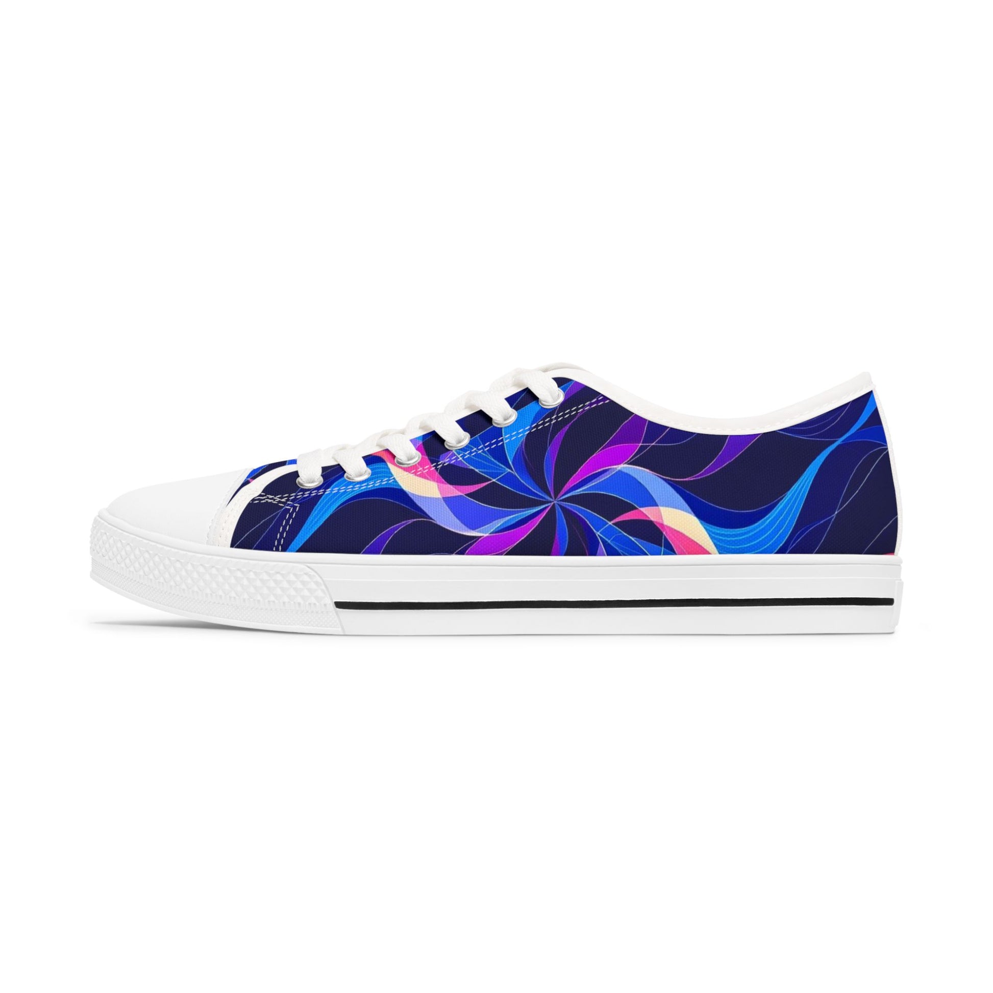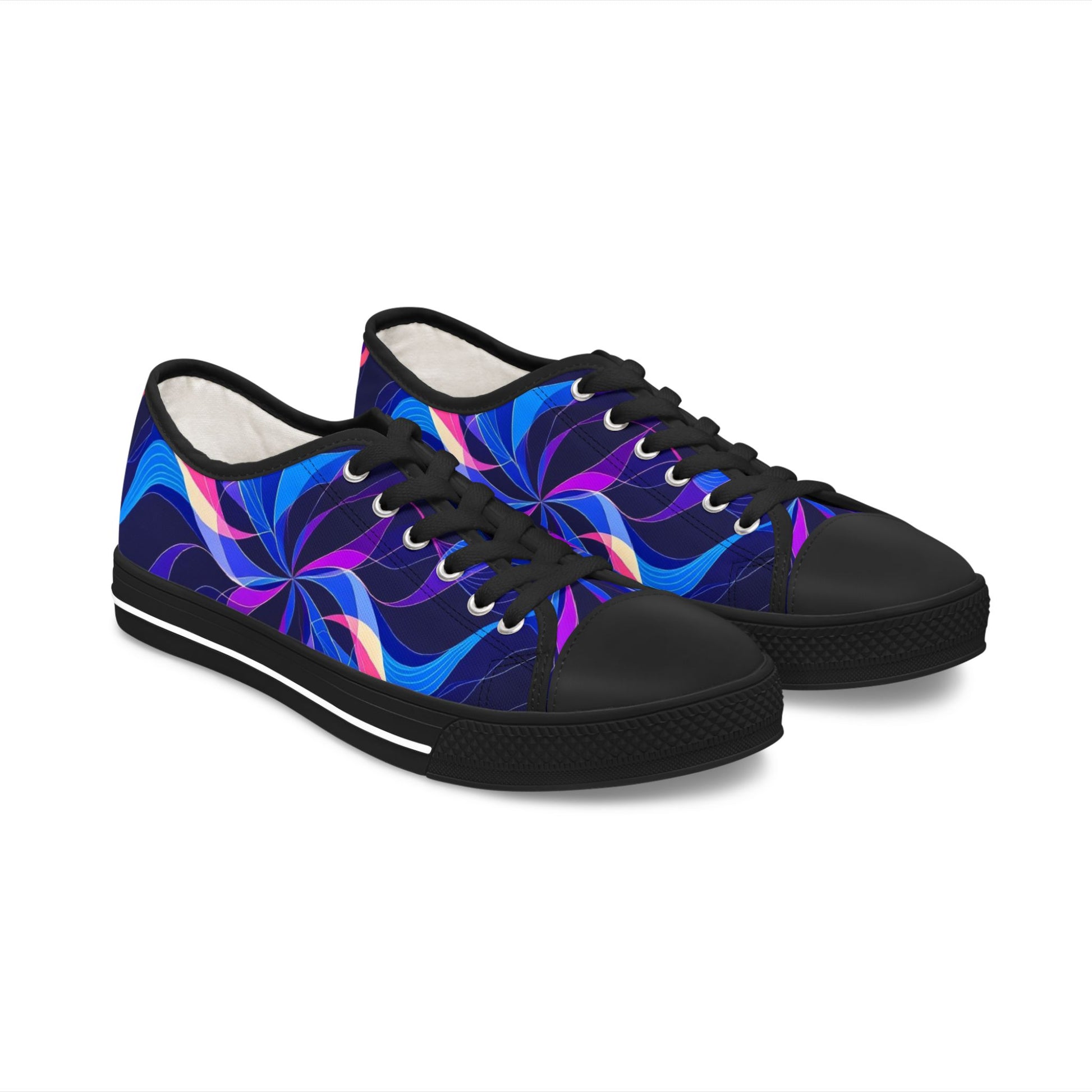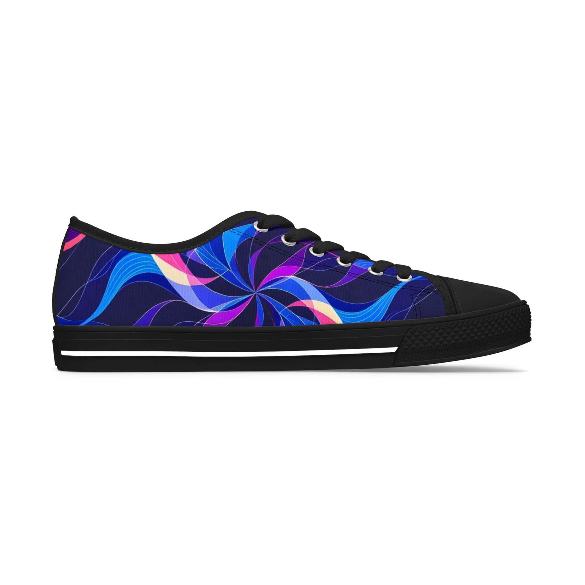 These low-top canvas sneakers bring vibrant motion to every step. Swirling indigo, violet and electric blue waves ripple across a full wraparound print, giving the shoe an energetic, almost kinetic look that stands out in urban streets or festival fields. The black pleather toe and silver metal eyelets add contrast and durability, while the hi-poly memory foam and EVA shock-absorbing insoles cushion long days on your feet. Lightweight EVA outsoles and breathable polyester canvas keep them easy to wear from morning commutes to late-night walks. They pair naturally with casual skirts, cropped jeans, or cargo pants when you want your footwear to be the conversation starter.