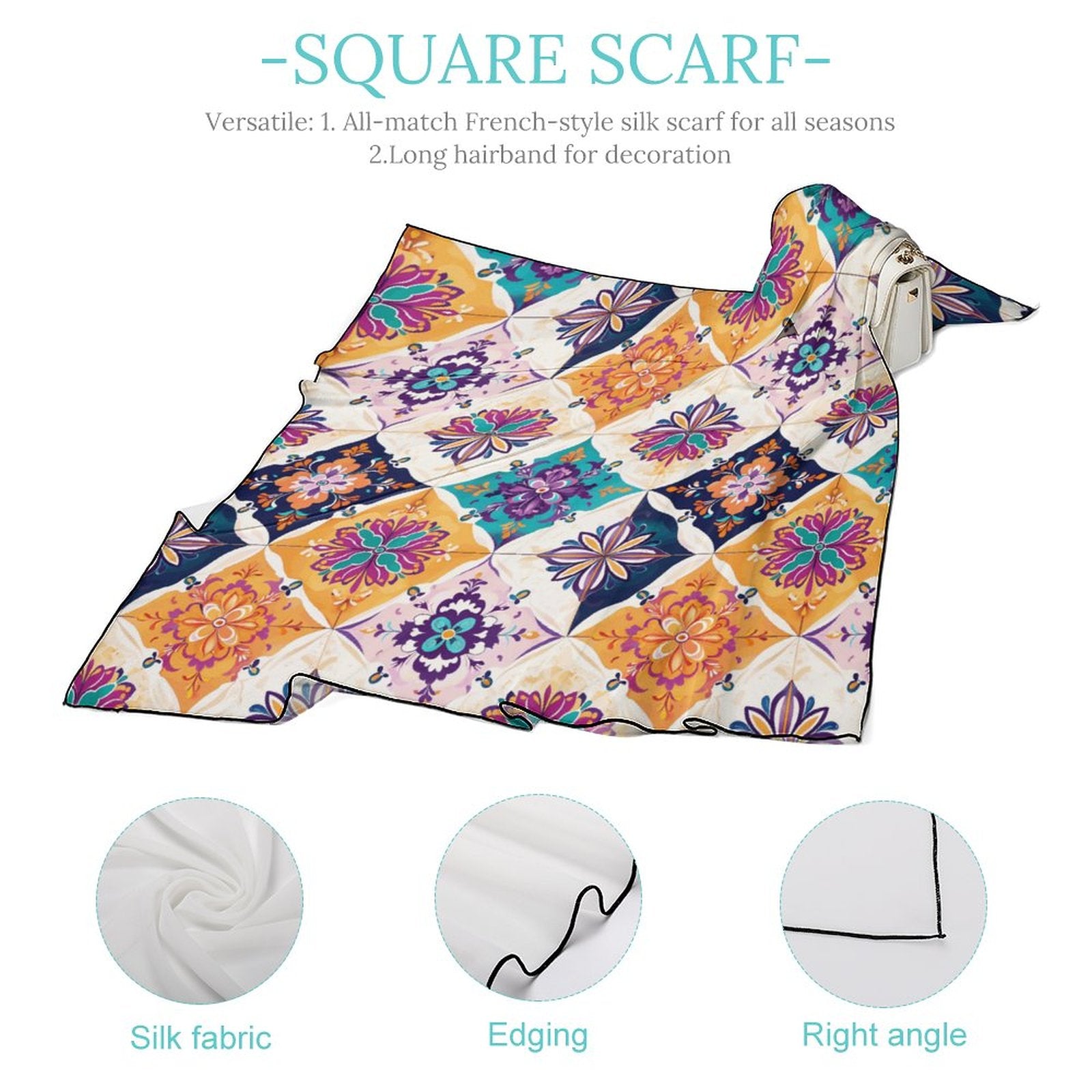 - Product Performance: The Women's Scarf is made of breathable, wrinkle-resistant and skin-friendly fabric, better than most satin scarf fabrics on the market. The Women's Scarf adopts precise hemming-stitch techniques, no jump needle and drop-off. The workmanship shows the texture of the product. The Women's Scarf offers different kinds of dressing ways. The Women's Scarf can be used as neckerchief, scarf bracelet, also head and hair band and so on. Also, the Women's Scarf can also be a decoration for leather bags, bamboo bags, paper bags, etc.