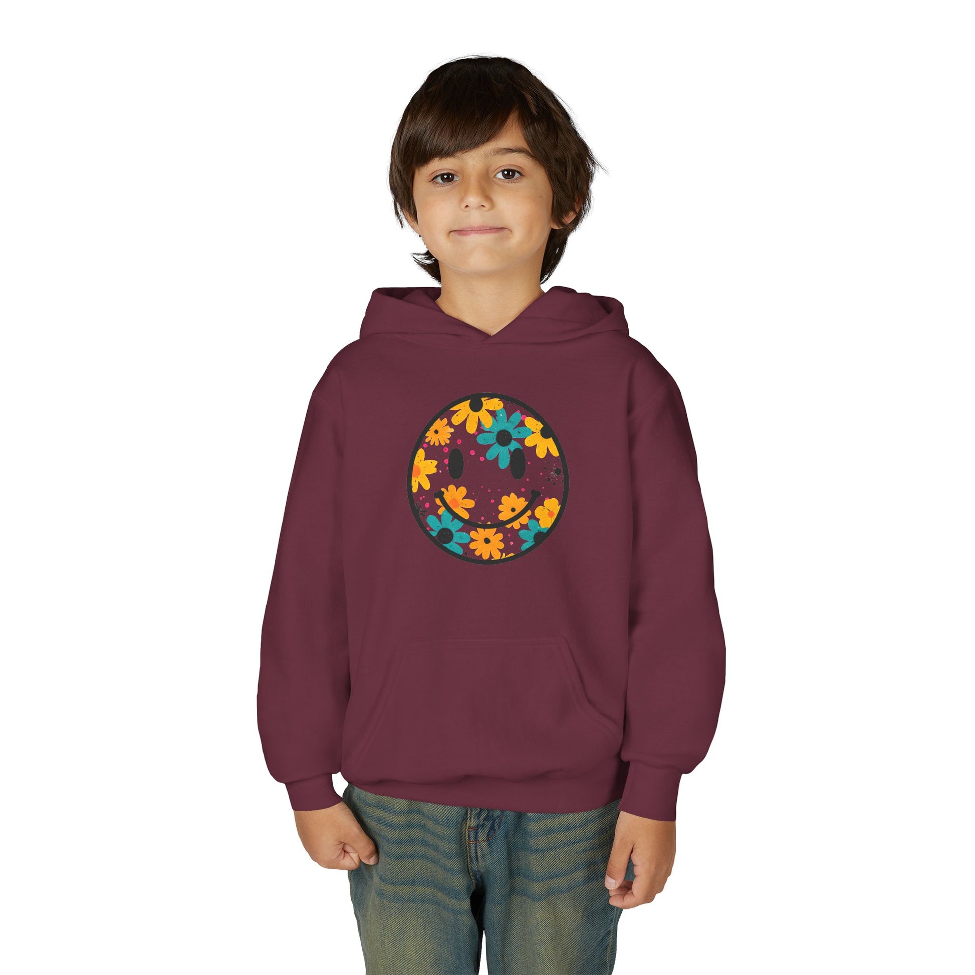 This youth hoodie carries a gentle, hand-drawn charm — a round floral medallion in warm oranges and teal blues that feels like a sunny afternoon at a neighborhood garden. Lightweight but sturdy, the mid-weight fabric and roomy kangaroo pocket make it a go-to layer for playground adventures, school runs, and chilly mornings. The soft twill necktape keeps the back of the neck comfortable during active days, while the clean white background lets the cheerful circle of flowers stand out without shouting. Built to hold up to play and repeated washes, it blends cozy wearability with a sweet, playful vibe that children and caretakers both appreciate.