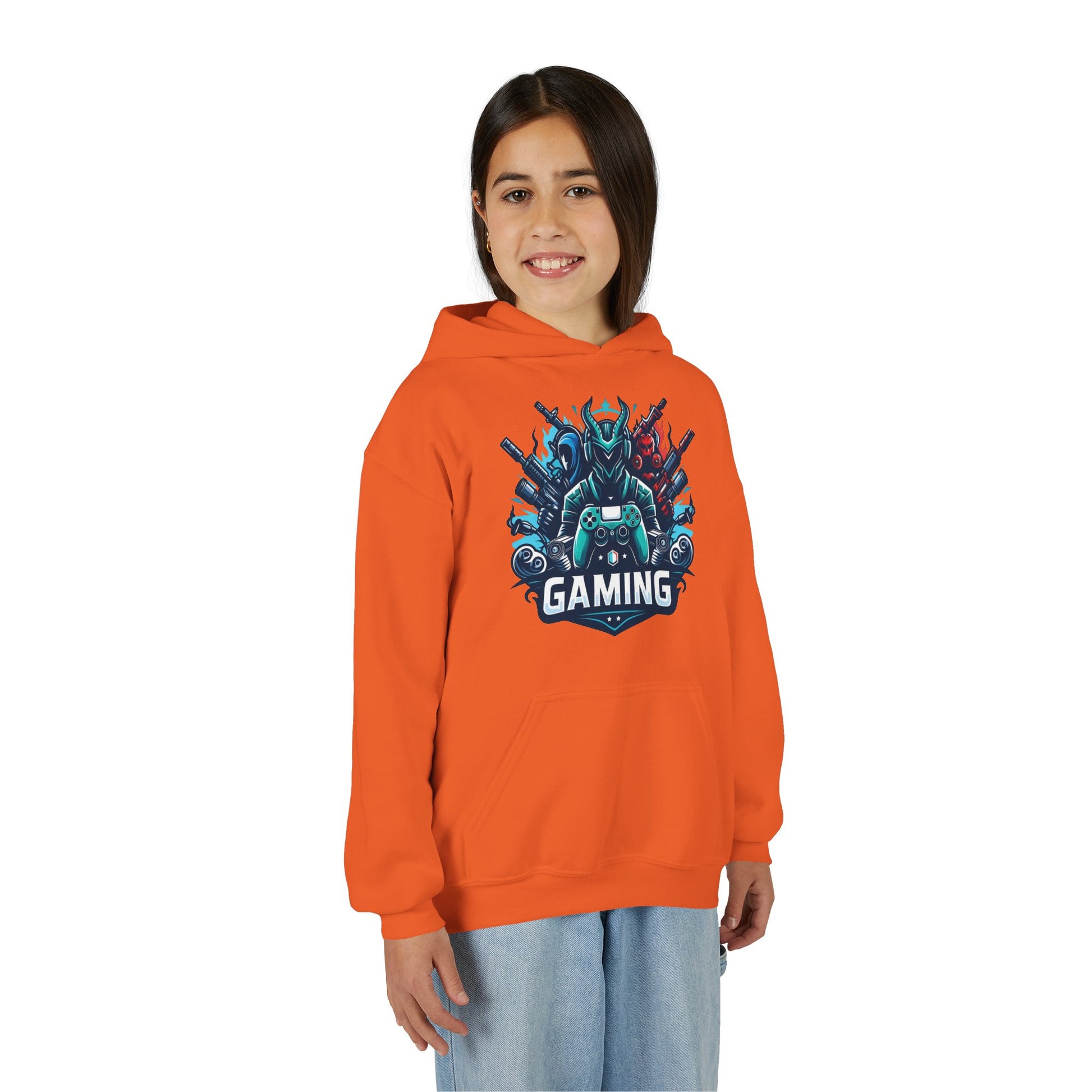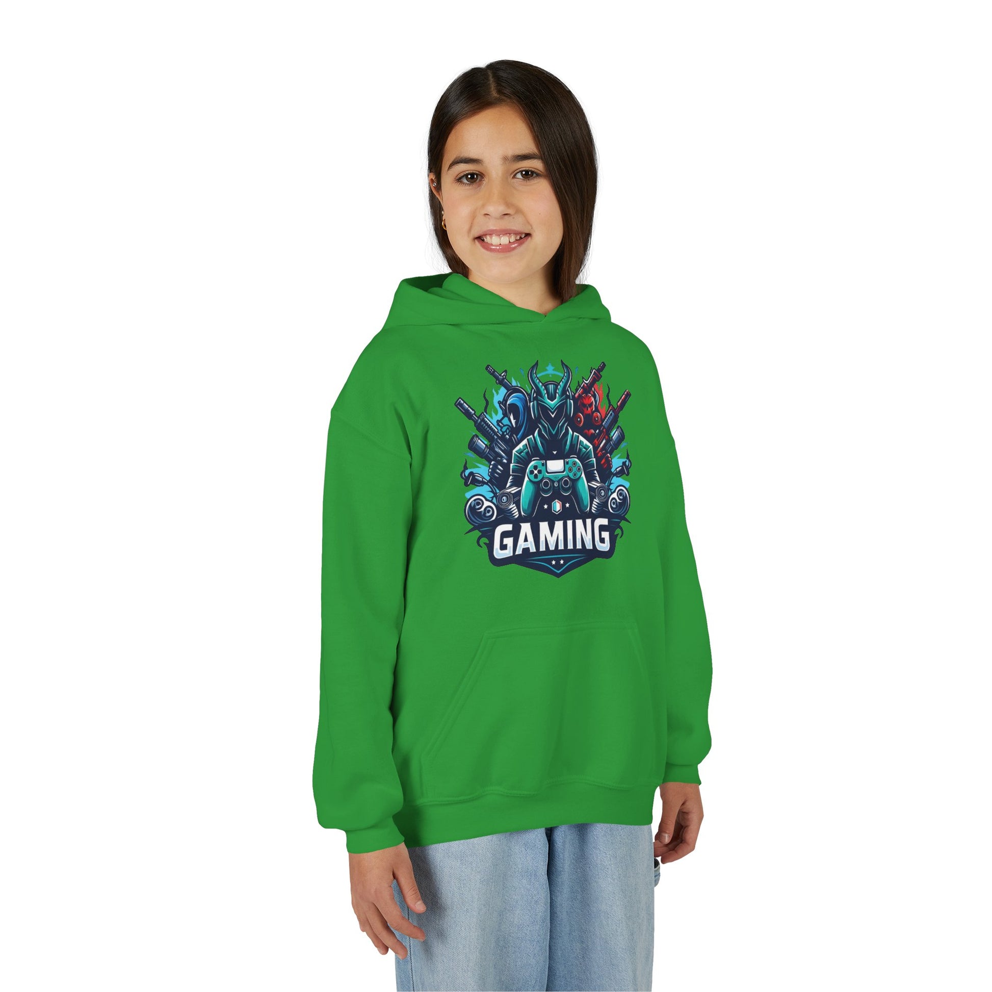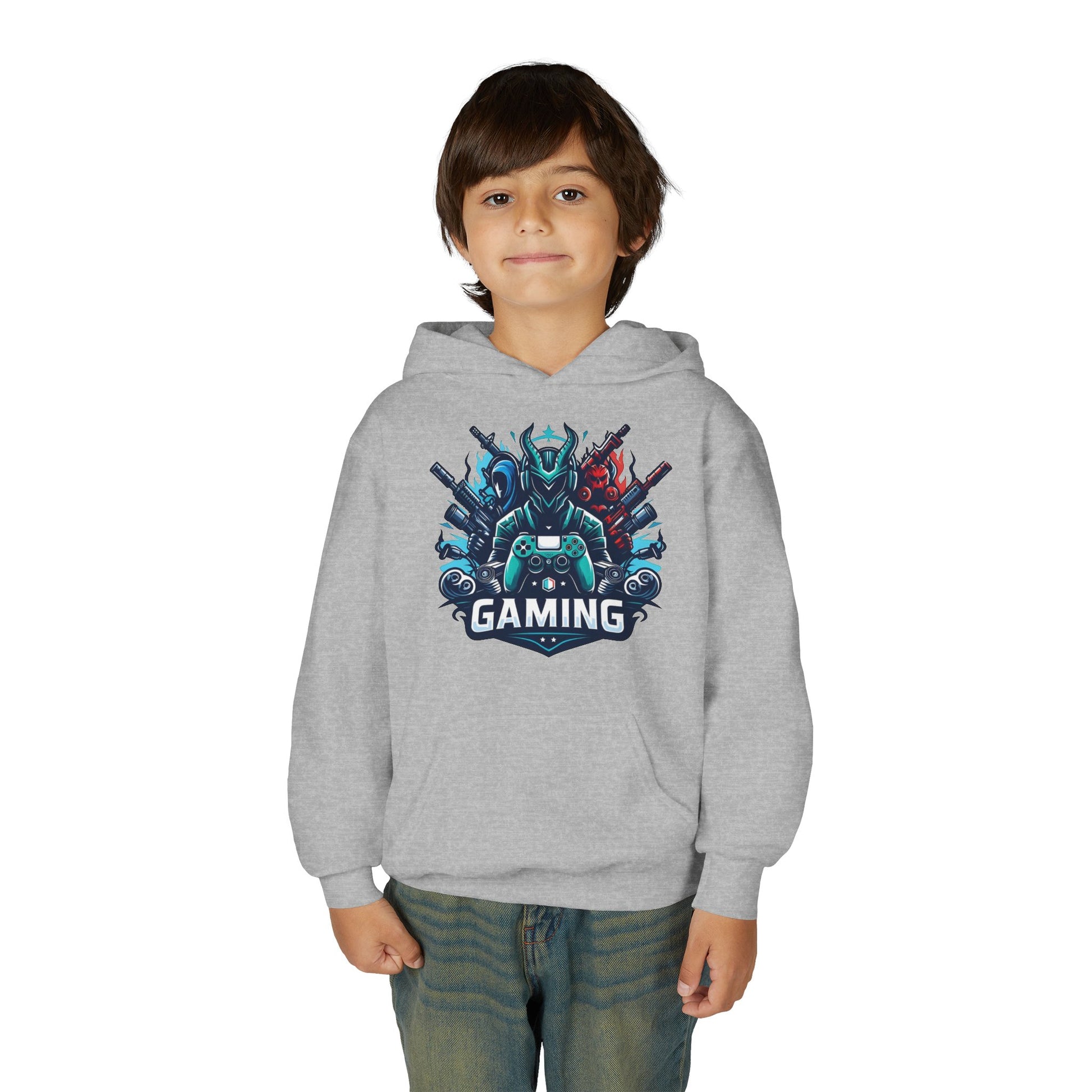 This youth hoodie carries the energy of late-night raids and victory screens. Soft, midweight fleece warms without weighing down small shoulders, while the bold gaming crest on the chest announces where their focus lives — controllers, headsets, and high scores. The roomy kangaroo pocket keeps hands cozy between matches and holds small treasures found during play. Durable blended fabric holds color and shape through washes and rough-and-tumble wear. Embroidered or printed accents keep the design sharp so the hoodie stays part of their go-to rotation for practice sessions, LAN meetups, or casual school days.